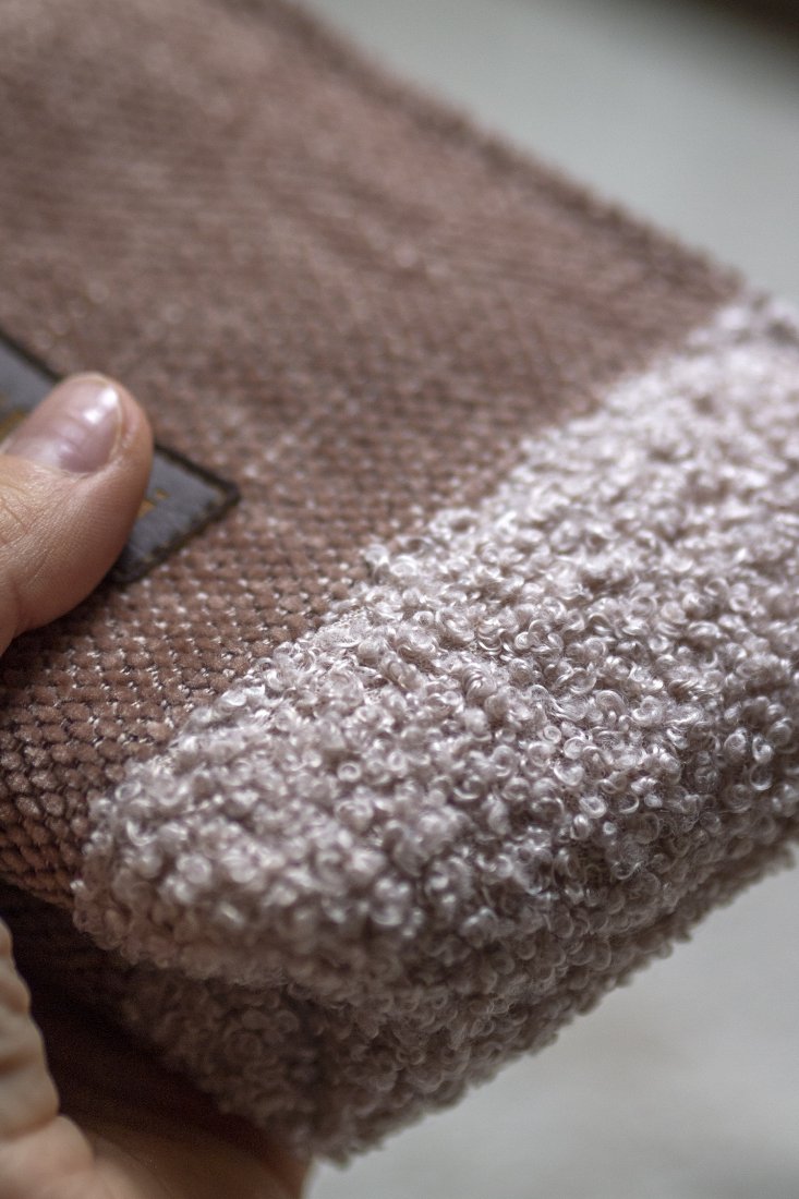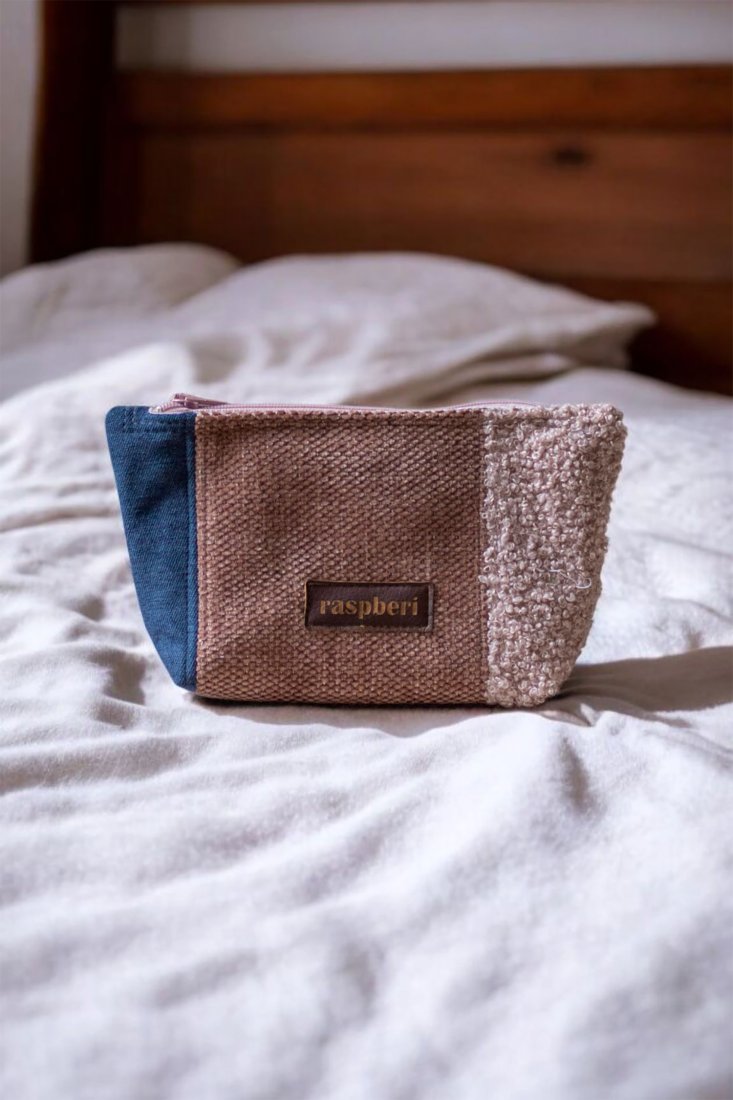 Średniej wielkości kosmetyczka wykonana z kilku rodzajów tkanin w kolorze różowym oraz granatowym.