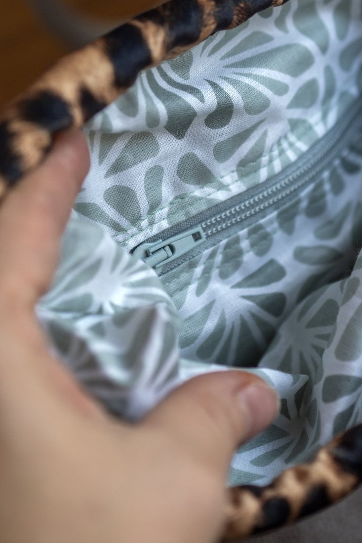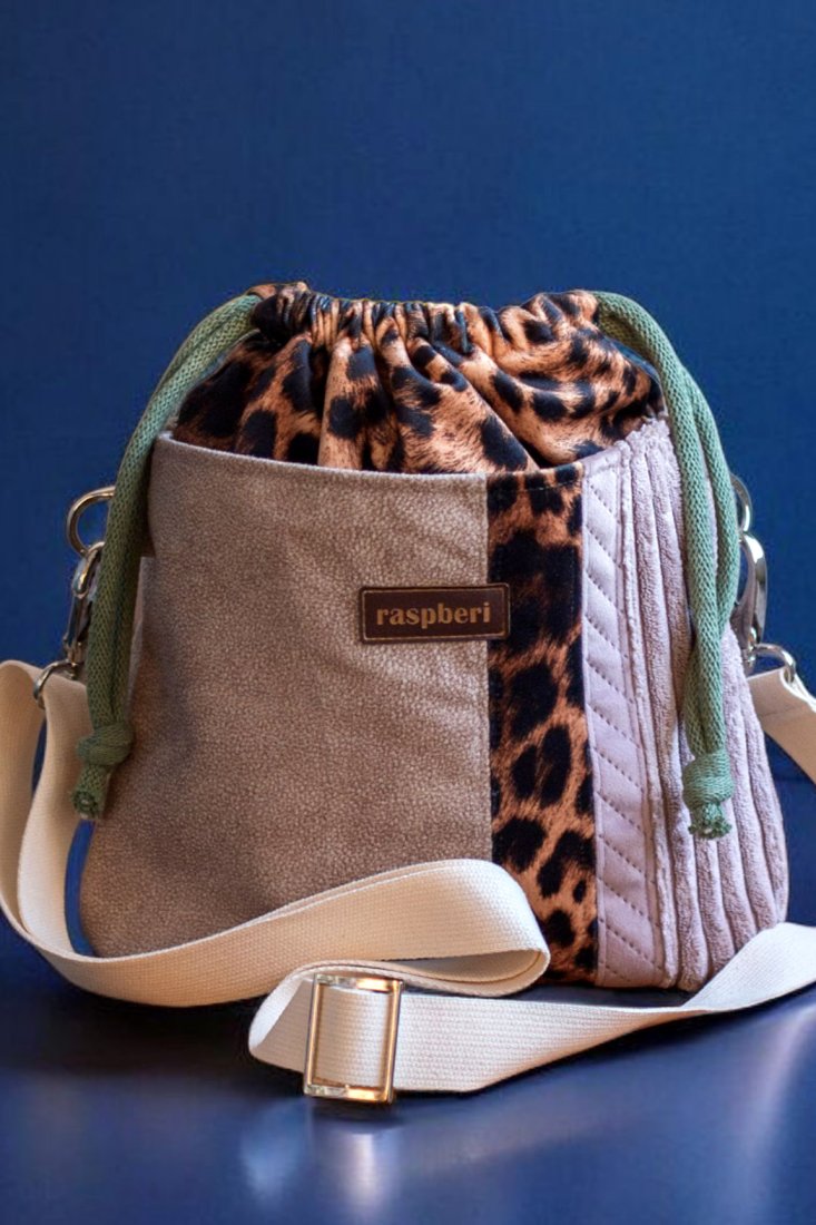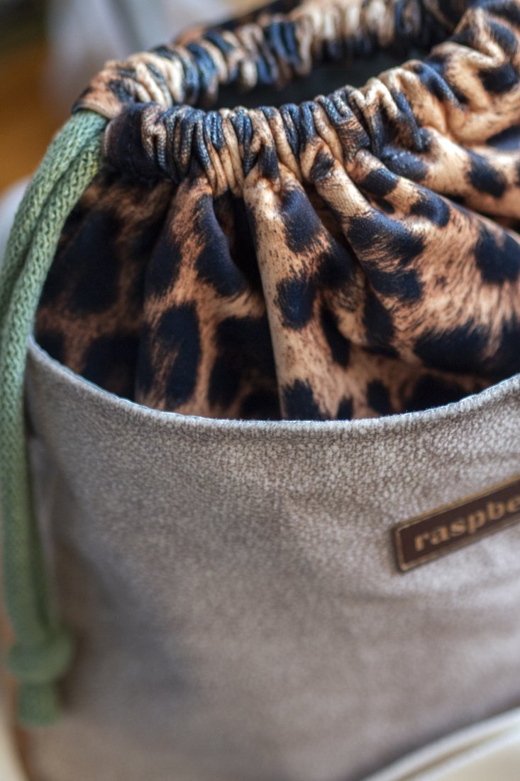 Wykonana z weluru w panterkę. Z przodu oraz z na tyle torebki kieszenie (np. na telefon czy chusteczki) z pudroworóżowego grubego sztruksu, pikowanego weluru, weluru w kolorze beżowym oraz weluru w panterkę. W środku kieszonka zapinana na suwak.