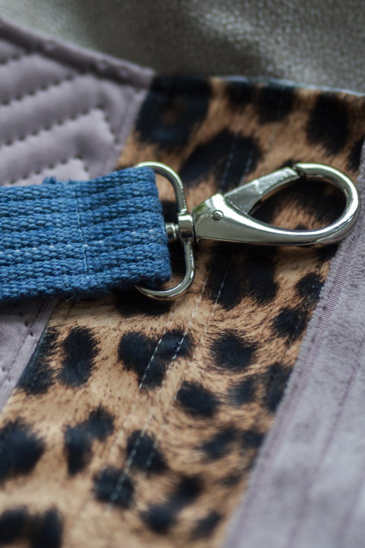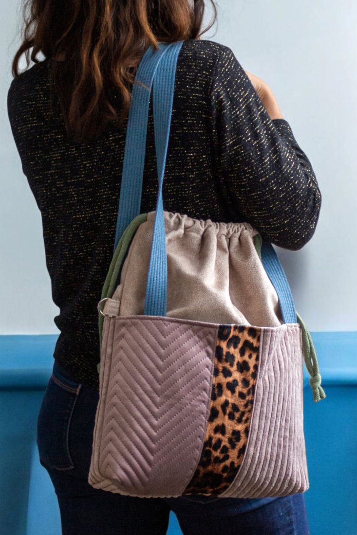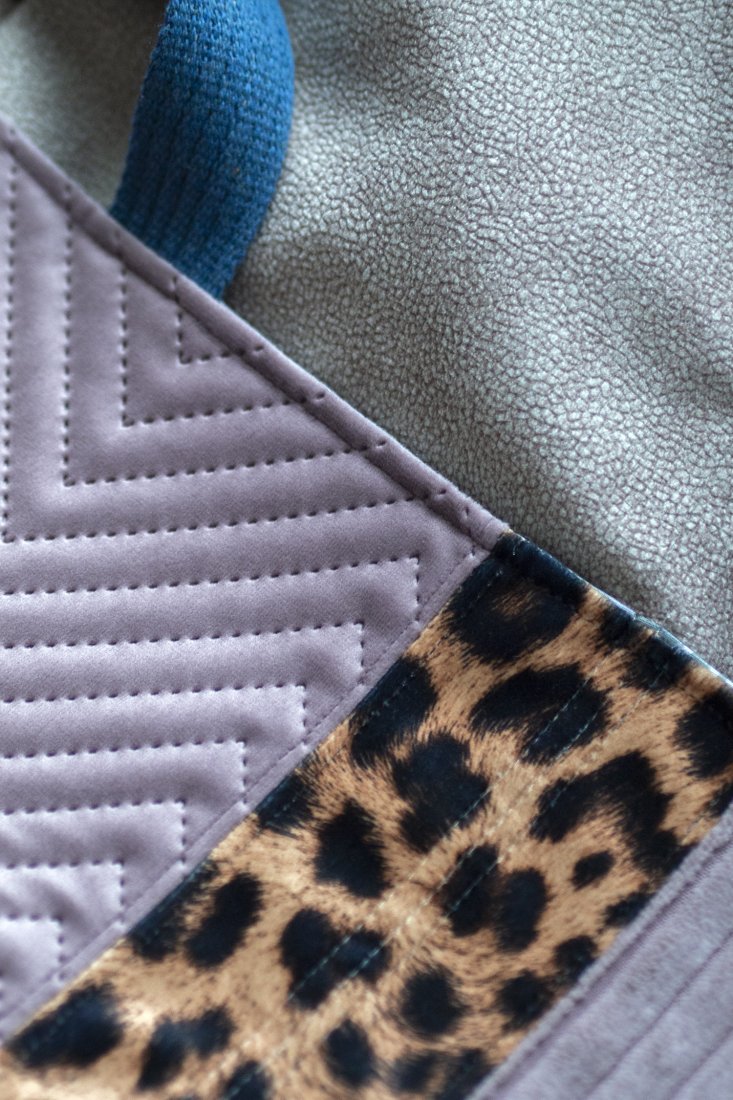 Torba worek wykonana z weluru, weluru w panterkę, pikowanego różowego weluru oraz grubego sztruksu. Stworzona w duchu no waste.