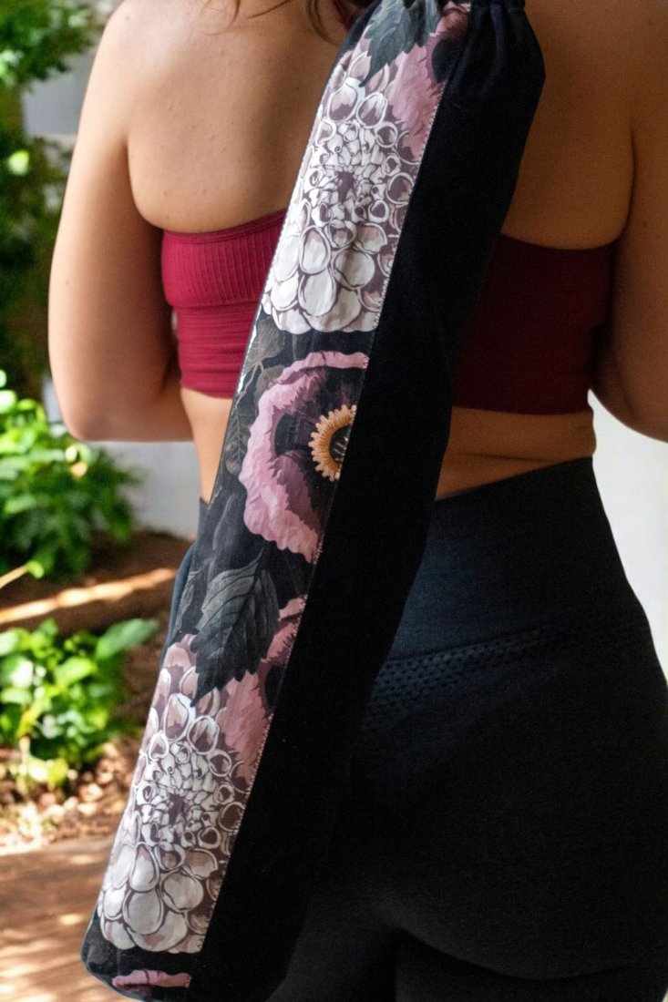 Plecak worek wykonany z kilku rodzajów kolorowych tkanin. Jego kształt sprawia, iż idealnie nadaje się na pokrowiec na matę do jogi.
