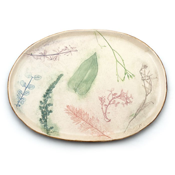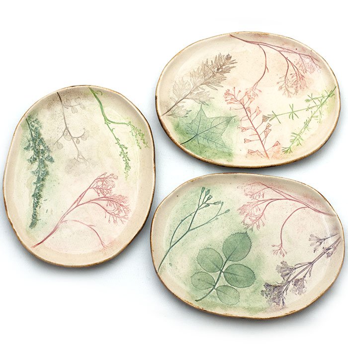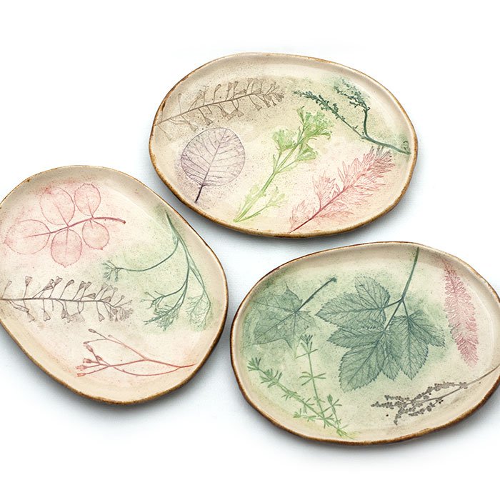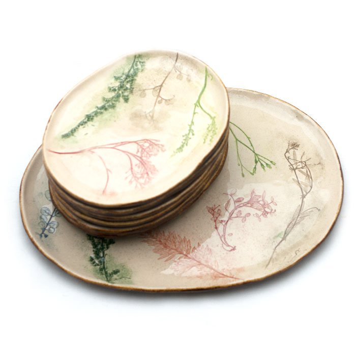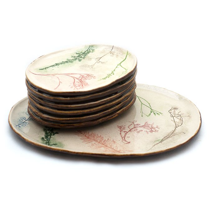 Ręcznie wykonany komplet ceramiczny z odciskanym motywem roślinnym.