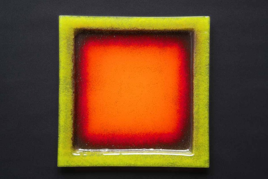 Ta szklana patera jest ręcznie cięta, barwiona i wypalana w wysokich temperaturach.