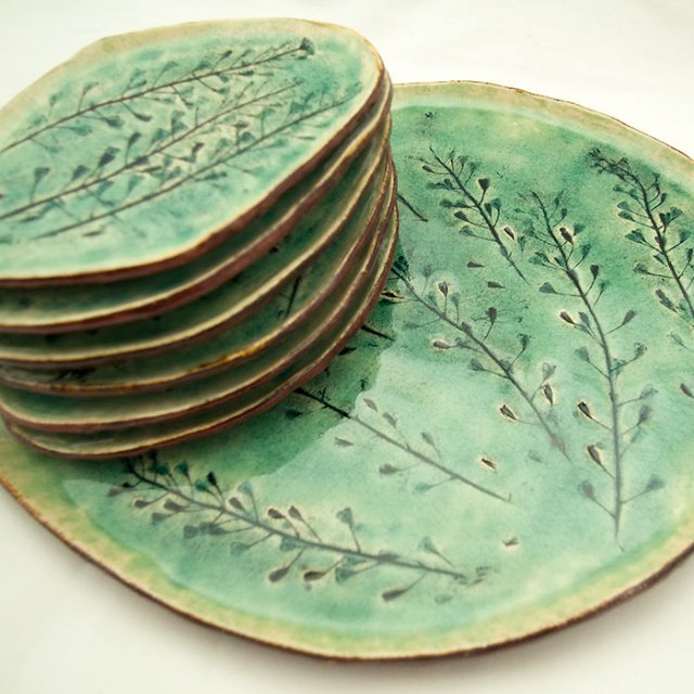 Jest to ręcznie wykonany komplet ceramiczny, patera i sześć talerzyków deserowych.