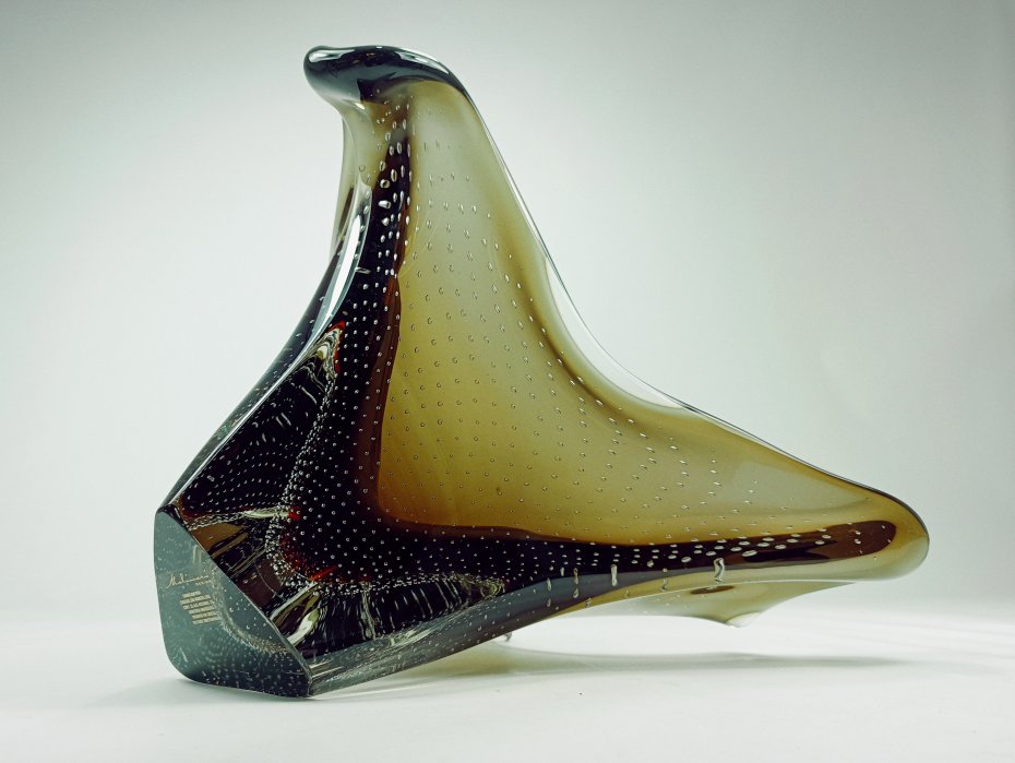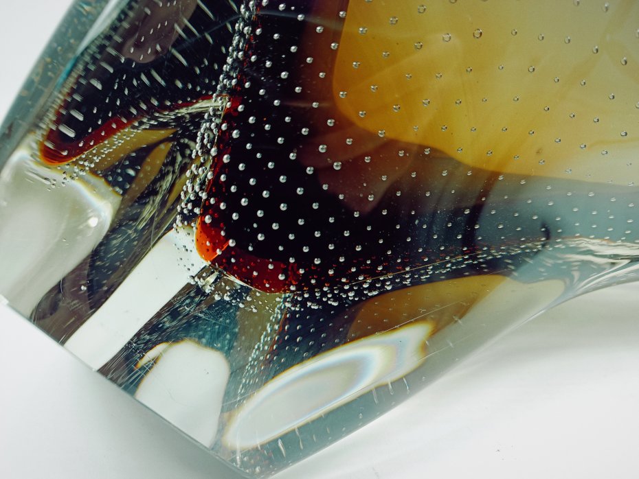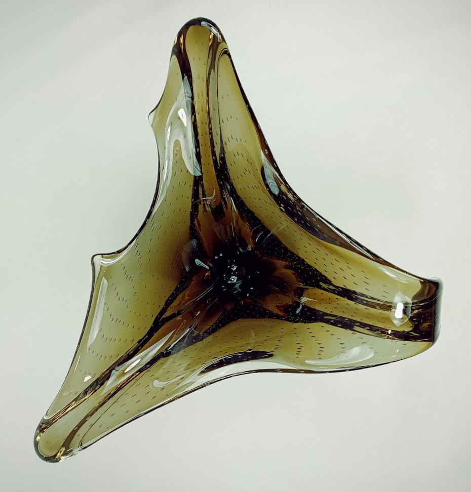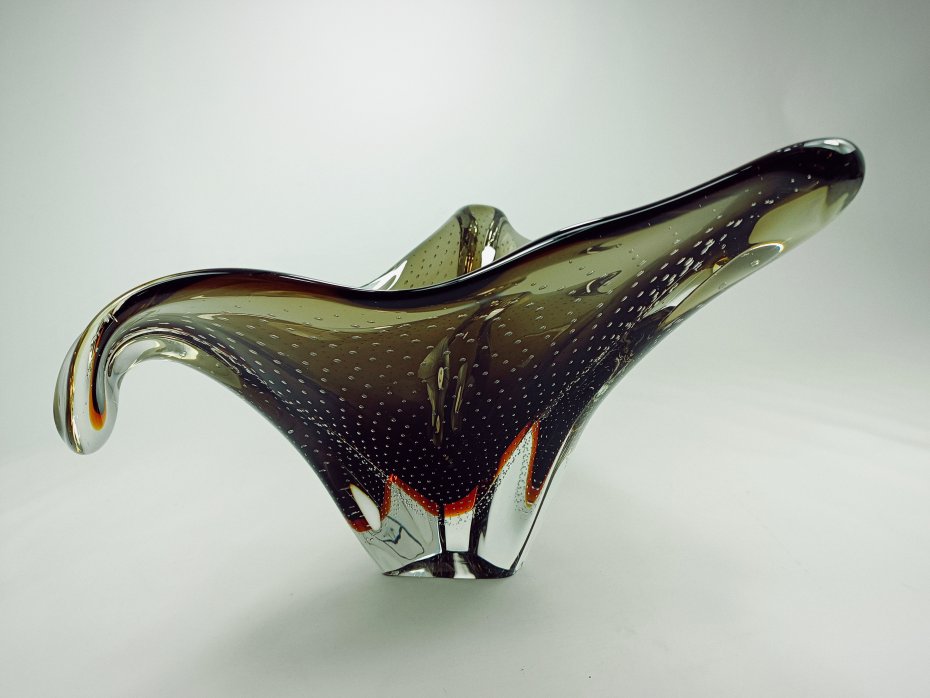 Szklana patera w odcieniach szarości, brązu i pomarańczu przy podstawie. Wewnątrz szkła zanurzone są charakterystyczne bąbelki powietrza. Ręcznie wykonane, unikatowe dzieło sztuki ze szkła z Brazylii, dzieło słynnej rodziny Molinari. Rodzina ta jest właścicielem jednej z największych na świecie firm zajmujących się dmuchaniem szkła z Murano, założonej w 1962 r. Bracia Molinari byli uczeni przez słynnego mistrza z Murano, Aldo Bonorę, pierwszego włoskiego mistrza, który przybył do Brazylii z Wysp Murano, bracia Molinari zapoczątkowali brazylijski styl wytwarzania szkła z Murano. Obdarzeni rzadkim darem, łączą talent z wytrwałością, tworząc spektakularne szkło dmuchane ustami. Po dziesięciu latach pracy dla innych mistrzów, bracia Molinari założyli własną pracownię Cristais Sao Marcos, gdzie tworzą i sprzedają własne projekty. Stan zachowania szkła - idealny. Wysokość 25 cm, szerokość 36 cm. Patera jest bardzo ciężka.