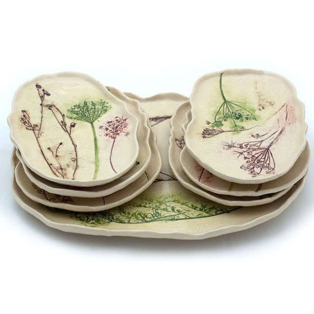 Jest to ręcznie wykonany komplet ceramiczny, patera i sześć talerzyków deserowych.