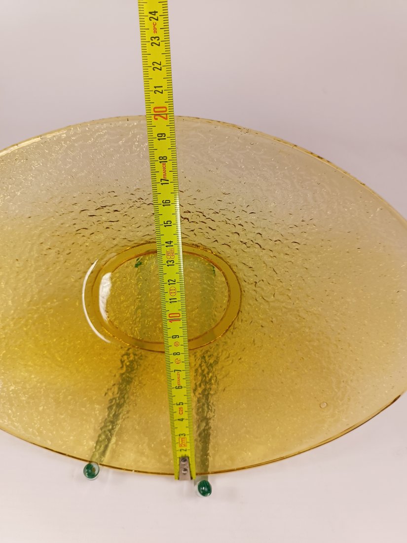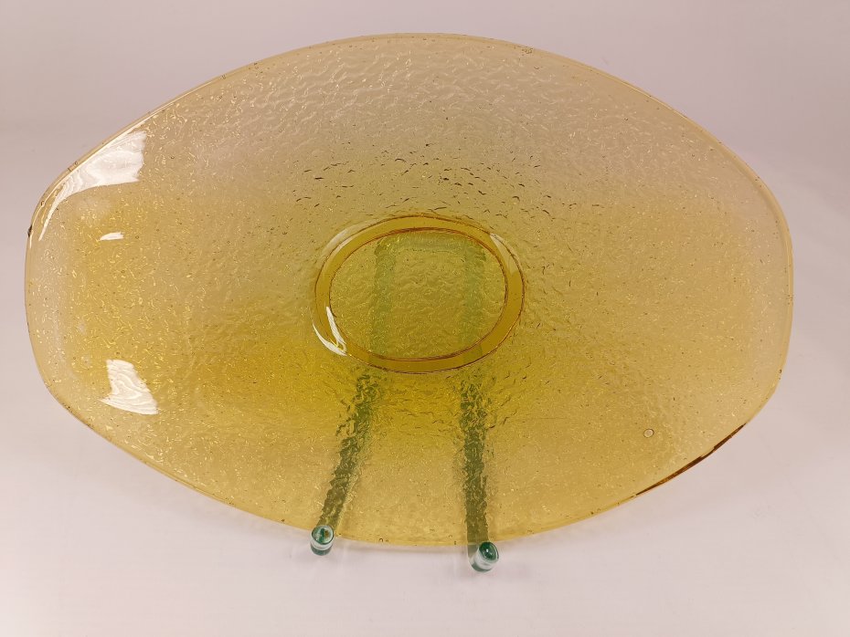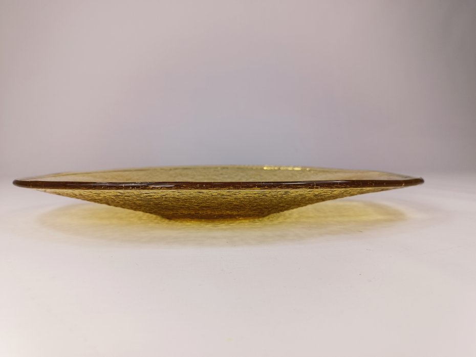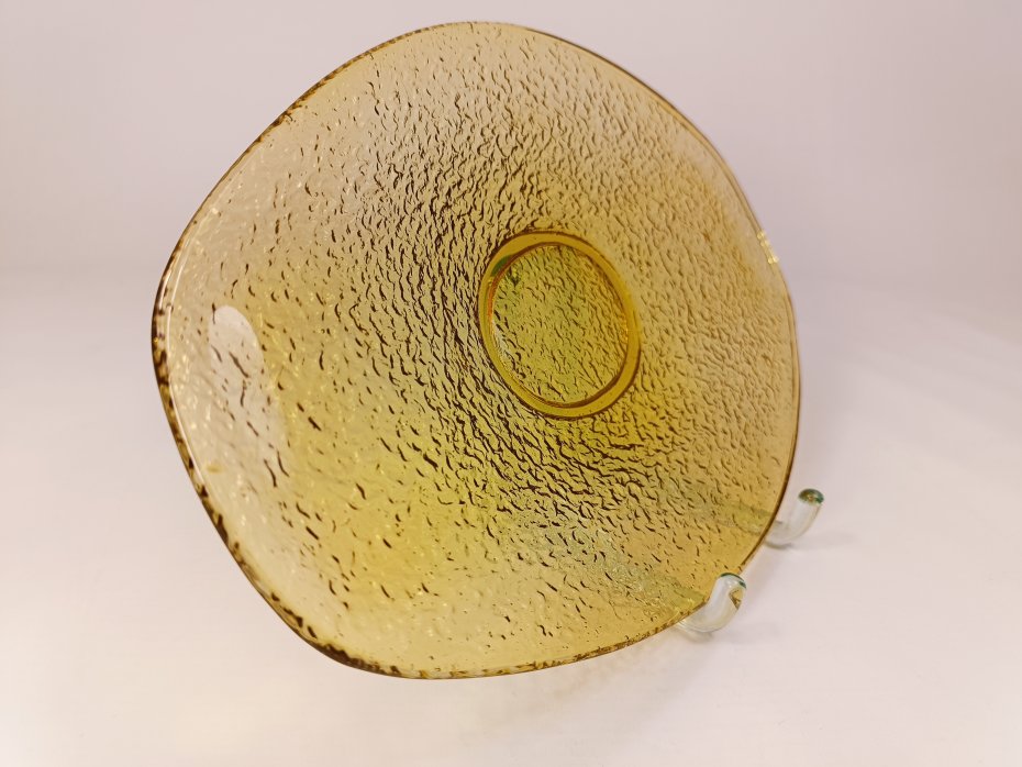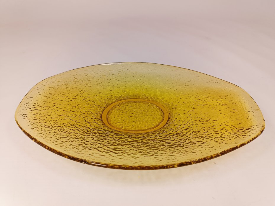 Duża patera Sahara, HSG Ząbkowice. Szkło prasowane barwione w masie, w kolorze miodowym. Stan zachowania bardzo dobry. Szerokość 30 cm.