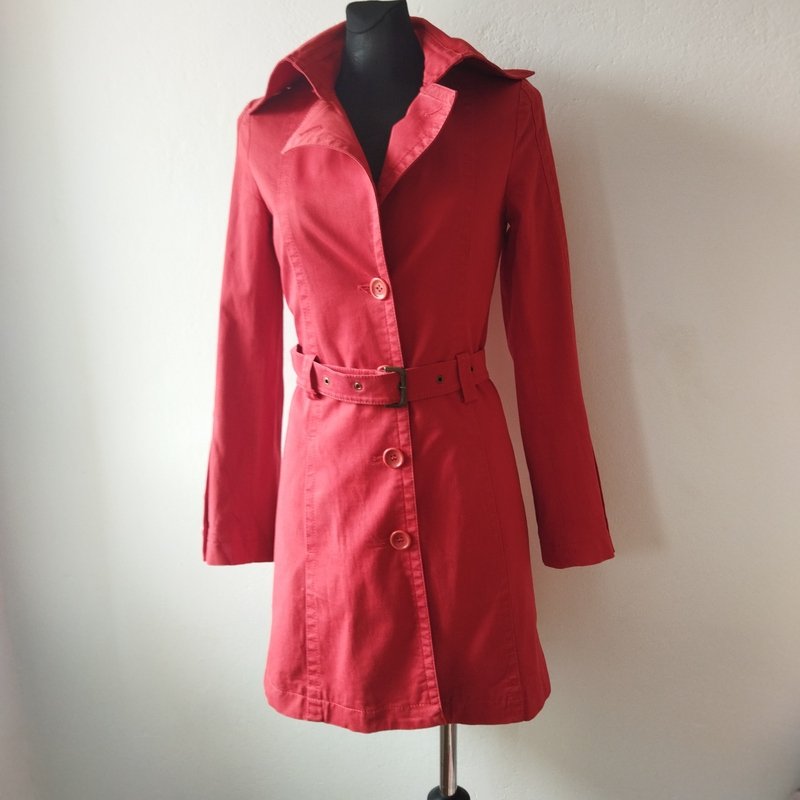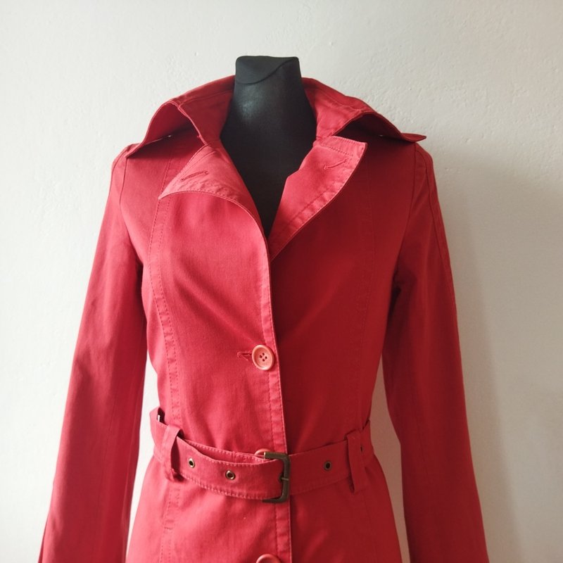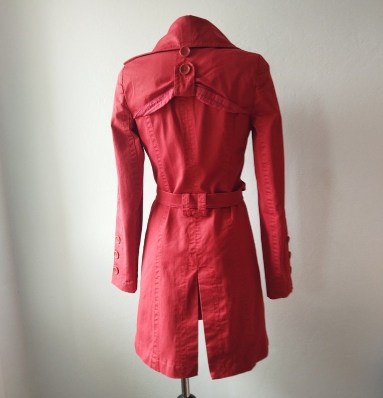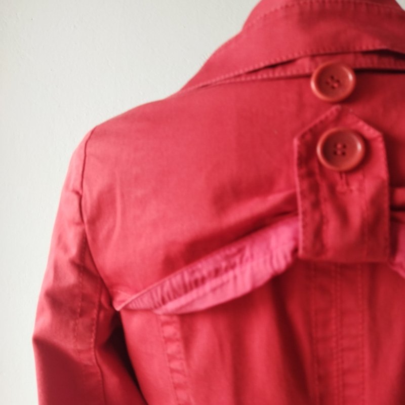 Zgrabny płaszczyk o ciekawym kroju z grubszej tkaniny bawełnianej w czerwonym kolorze. taliowany z kołnierzem z rewersami z możliwością zapięcia pod samą szyję, z dwiema wpuszczanymi kieszeniami w szwach środkowych, w talii pasek z klamerką z naszywanymi szlufkami, z tyłu na plecach podpinana a' la pelerynka, u dołu rozcięcie, zapinany na sygnowane guziki, na takie same guziki zapinane mankiety rękawów. całość na podszewce