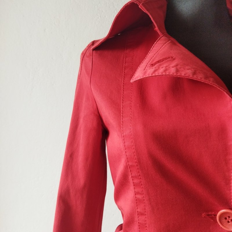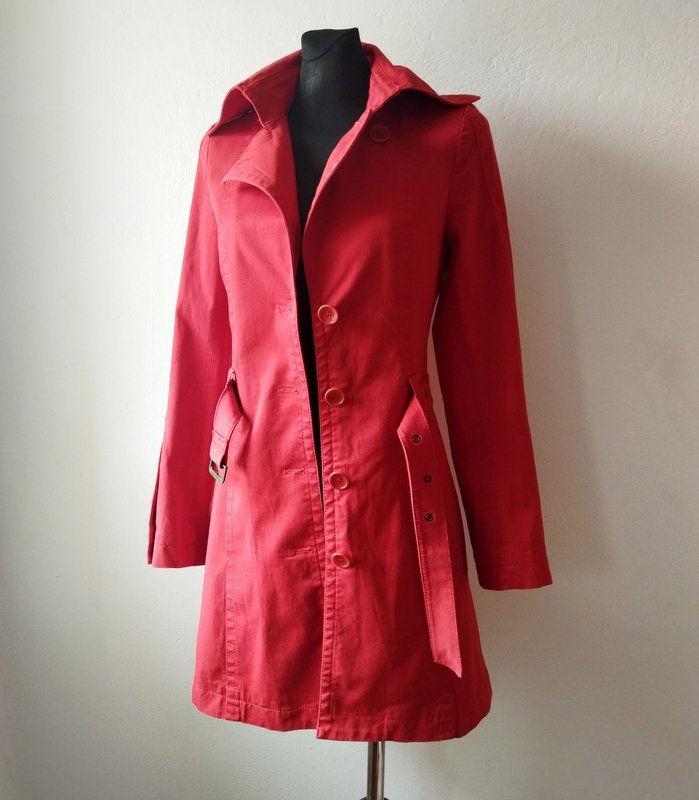 Zgrabny płaszczyk o ciekawym kroju z grubszej tkaniny bawełnianej w czerwonym kolorze. taliowany z kołnierzem z rewersami z możliwością zapięcia pod samą szyję, z dwiema wpuszczanymi kieszeniami w szwach środkowych, w talii pasek z klamerką z naszywanymi szlufkami, z tyłu na plecach podpinana a' la pelerynka, u dołu rozcięcie, zapinany na sygnowane guziki, na takie same guziki zapinane mankiety rękawów. całość na podszewce