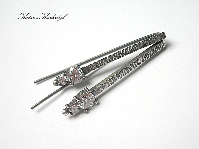 Kolczyki w całości wykonane ze srebra [pr. 925] w połączeniu z cyrkoniami [5mmi 3mm] . Całość oksydowana i przetarta.Całkowita długość kolczyków 4,4cm.Biżuteria ozdobnie zapakowana.