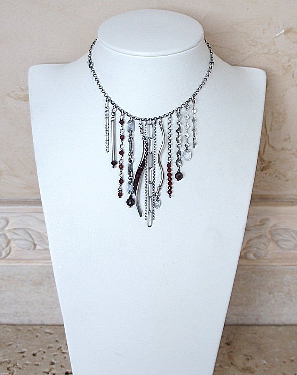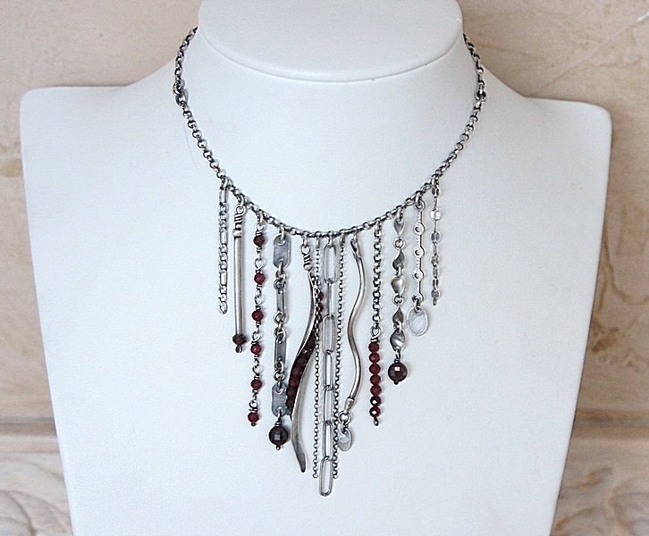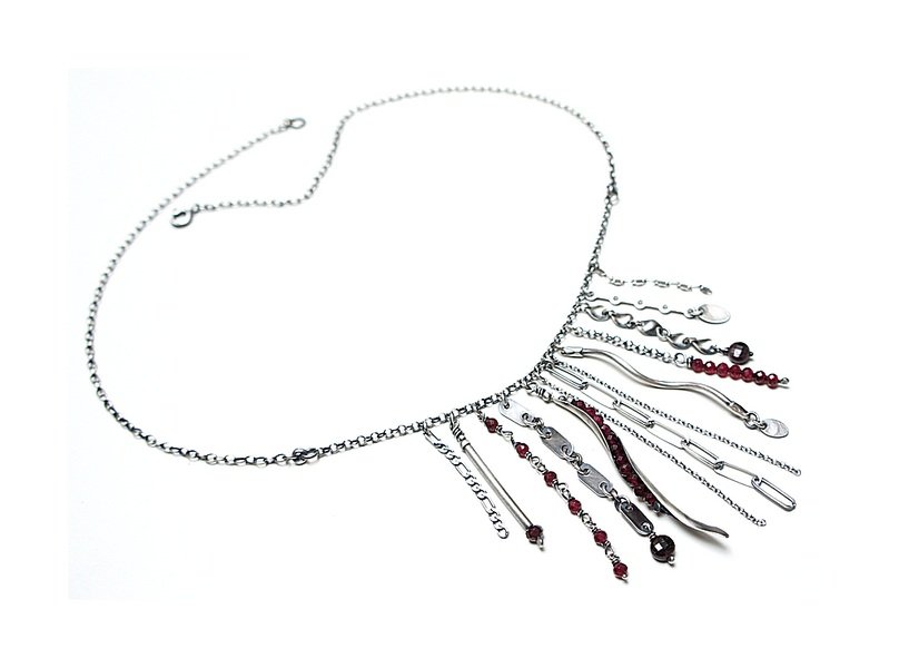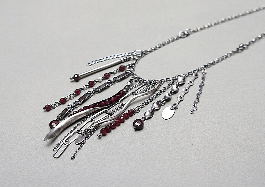 Naszyjnik wykonany ręcznie ze srebra [pr. 925] w połączeniu z fasetowaną pastylkami granatów [6mm] ,fasetowaną kuleczką granatu [4mm] , fasetowanymi rubinami [syntetyczne -3mm] oraz srebrnymi zawieszkami . Srebro oksydowane i przetarte. Całkowita długość naszyjnika 48cm. Biżuteria ozdobnie zapakowana