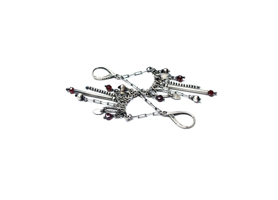 Kolczyki wykonane ze srebra [pr. 925] w połączeniu z fasetowanymi granatami [4mm i 3mm] . Srebro oksydowane i przetarte. Całkowita długość kolczyków 8cm. Biżuteria ozdobnie zapakowana.