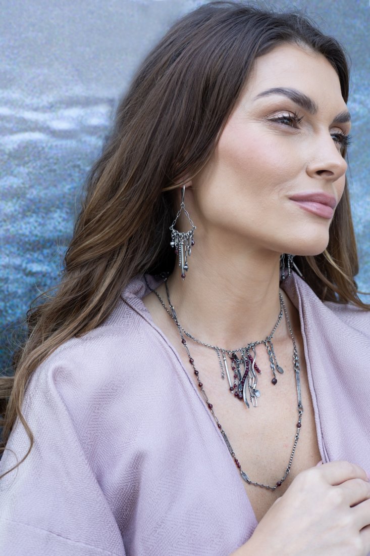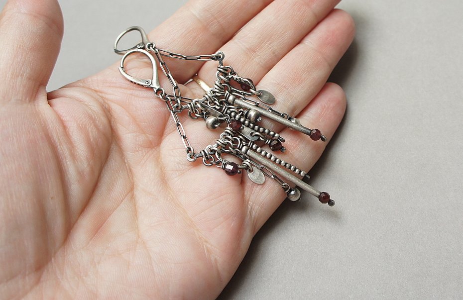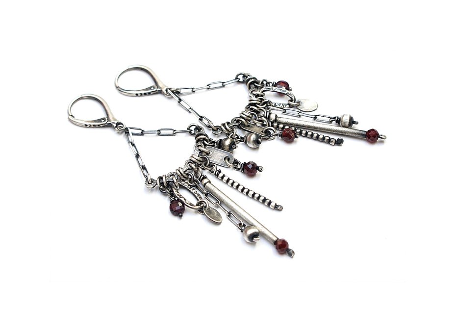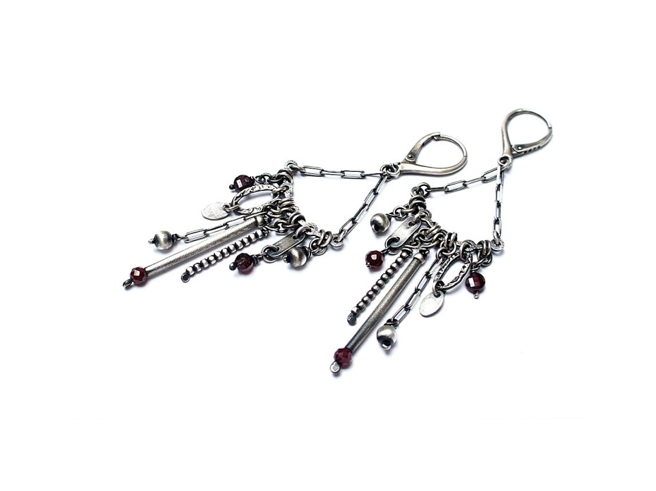 Kolczyki wykonane ze srebra [pr. 925] w połączeniu z fasetowanymi granatami [4mm i 3mm] . Srebro oksydowane i przetarte. Całkowita długość kolczyków 8cm. Biżuteria ozdobnie zapakowana.