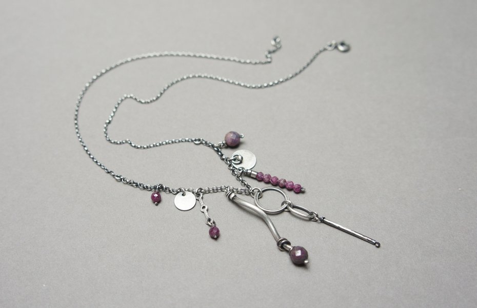 Naszyjnik wykonany ze srebra [pr. 925] w połączeniu z fasetowanymi kuleczkamirubinów [6mm ,4mm i 3mm ] oraz srebrnymi zawieszkami . Srebro oksydowane i przetarte. Całkowita długość naszyjnika 46cm. Biżuteria ozdobnie zapakowana