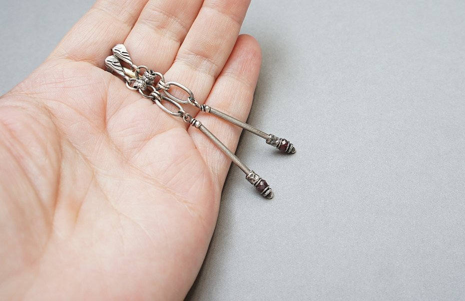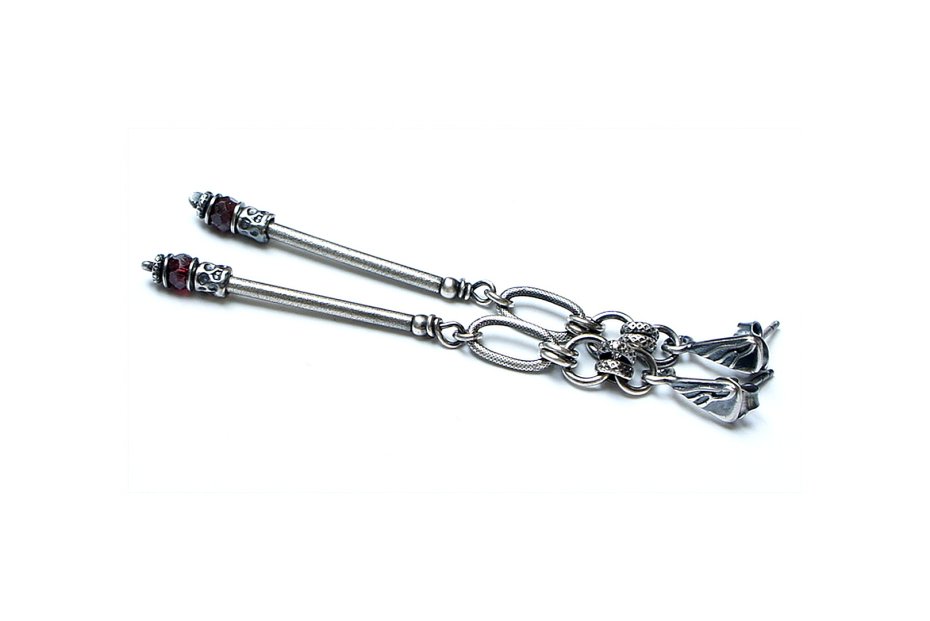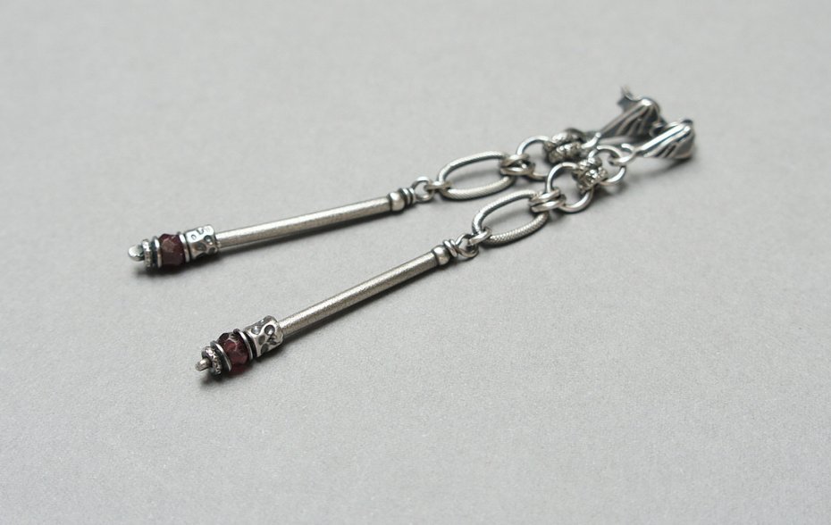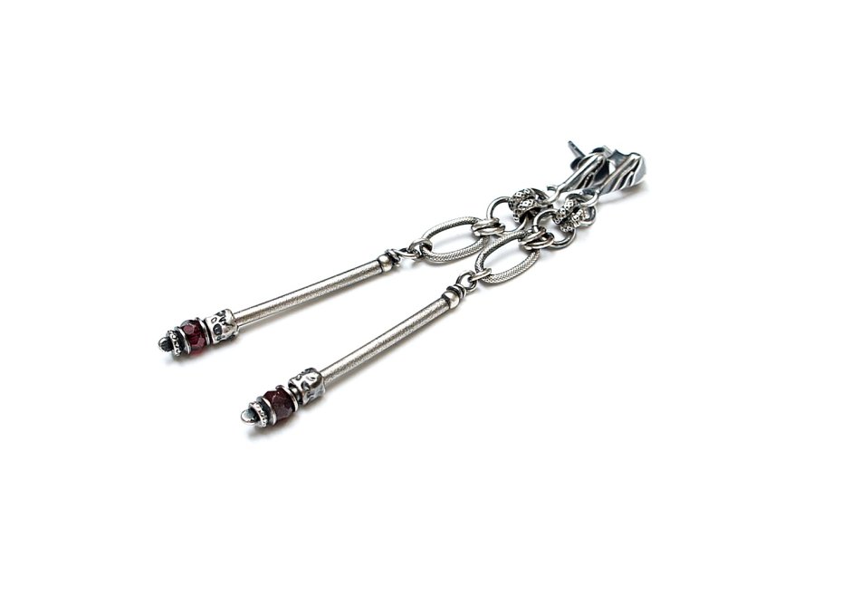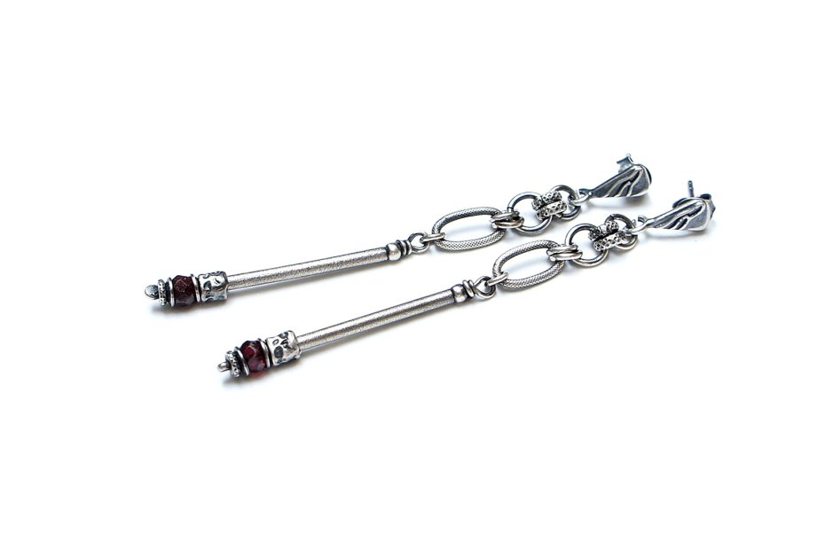 Kolczyki wykonane ze srebra [pr. 925] w połączeniu z fasetowanymi granatami [4mm]. Srebro oksydowane i przetarte. Całkowita długość kolczyków 7,2cm. Biżuteria ozdobnie zapakowana.