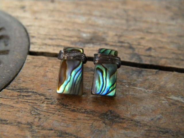 kolczyki.muszla paua w ocynowanej miedzi. sztyfty i baranki ze srebra. długość 1,2cm