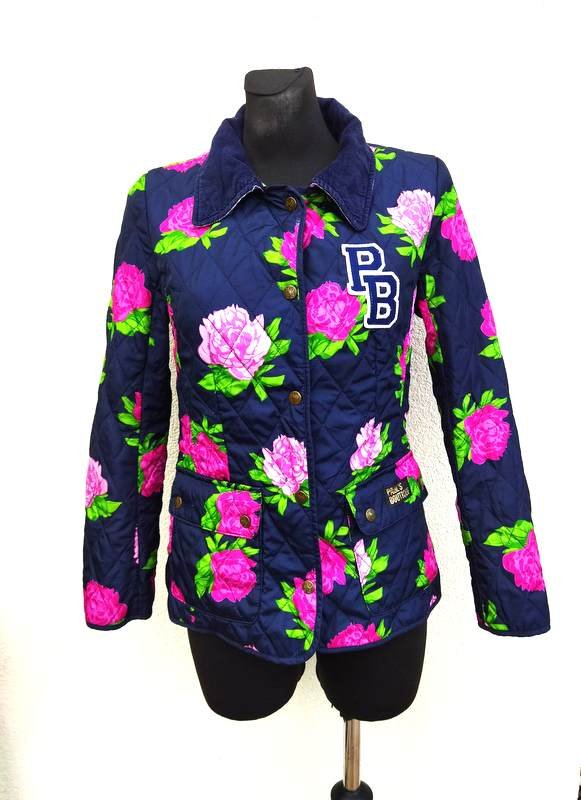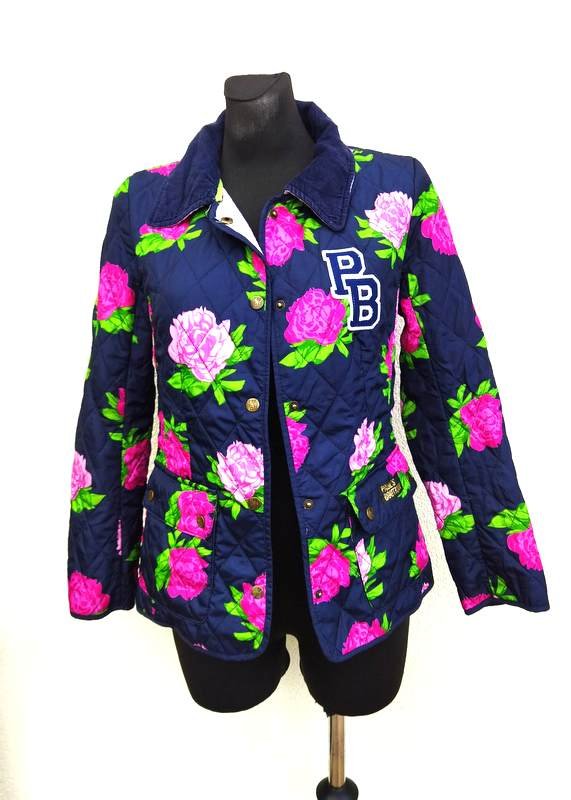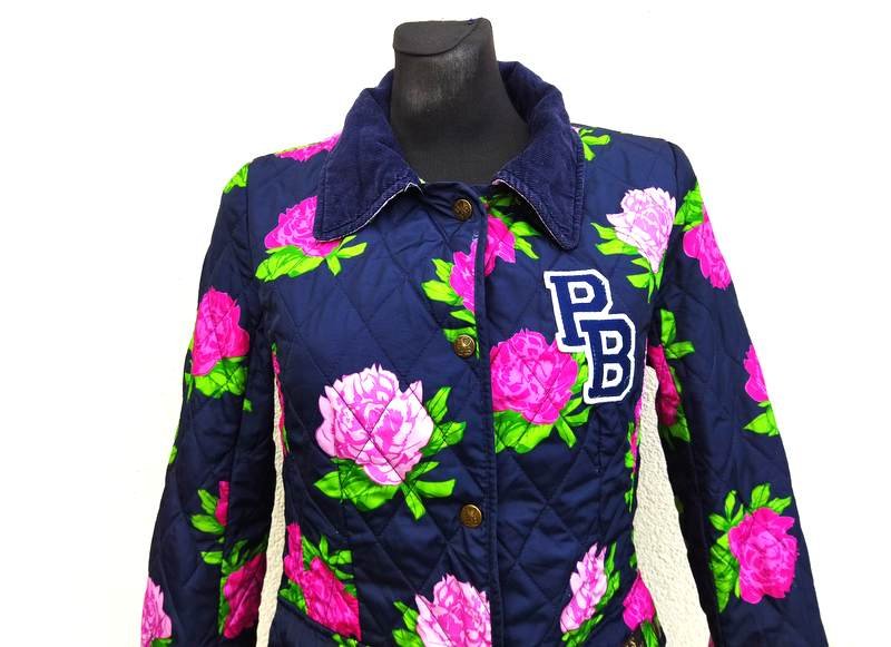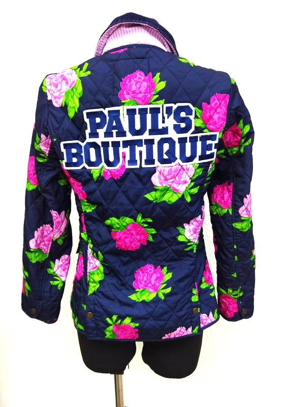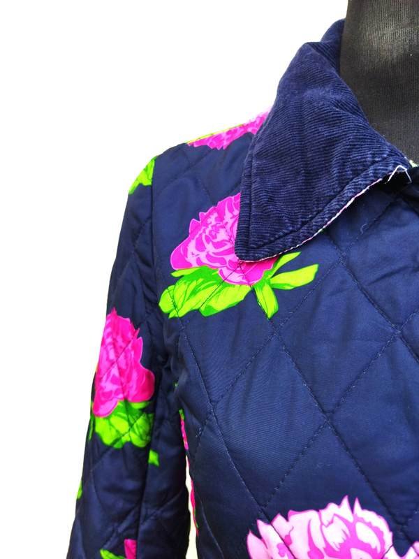 Zgrabna urocza kurtka z pikowanej tkaniny z różanym wzorem na ciemnogranatowym prawie czarnym tle, z napisem na plecach, od wewnątrz w biało-różowe paseczki. zapinana na napy w kolorze starego mosiądzu. Z kołnierzykiem, z dwiema naszywanymi kieszeniami z patkami zapinanymi na napy, z tyłu i u dołu rękawów rozcięcia zapinane na napy.