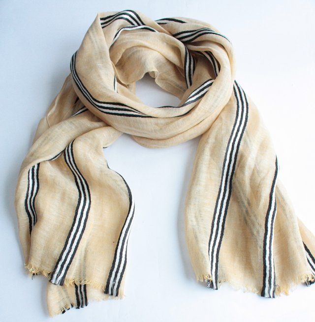 Piękny, luźno tkany szal w piaskowym odcieniu beżu, ozdobiony biało-czarnymi pasami. Szal luksusowej marki Paul Smith.