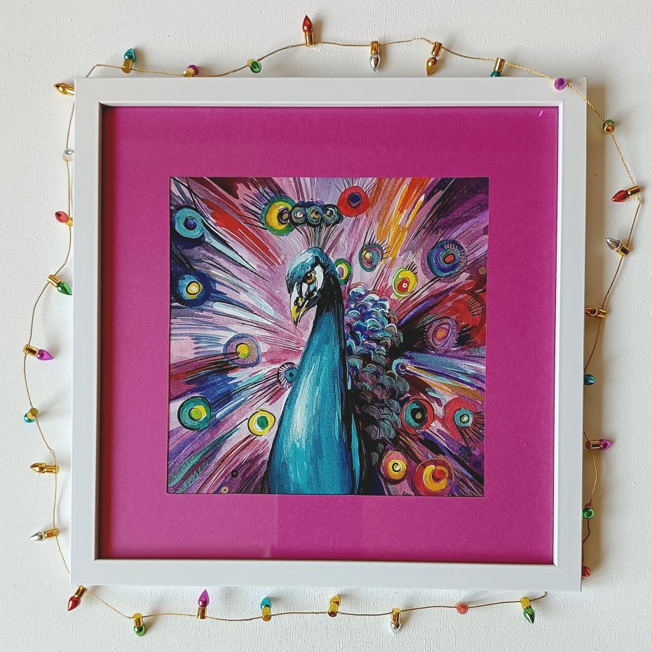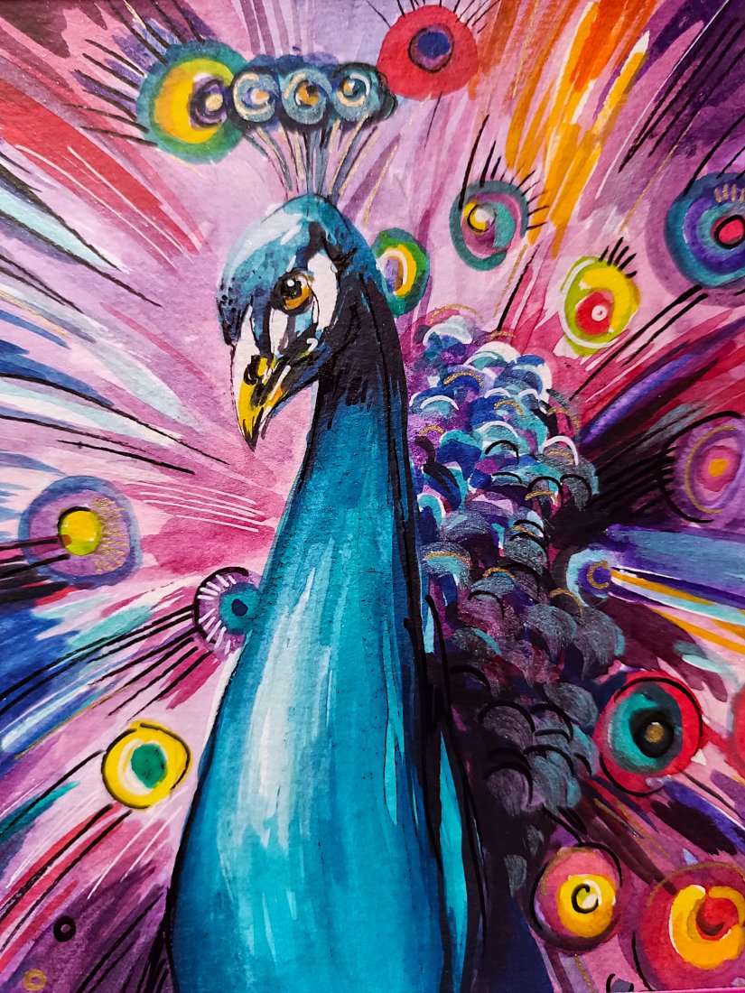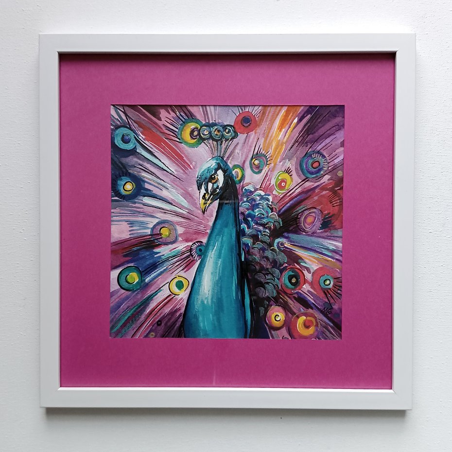 Piękny i kolorowy Paw. Akwarela namalowana na papierze 250g z użyciem cienkopisów Winsor&Newton, złoty gellpen Sakura i POSCA i farb Derwent, a także gdzieniegdzie specjalnych akwareli z delikatnym metalicznym połyskiem. Akwarelka oprawiona jest w passe-partou i ramę za szkłem. Posiada podpórkę,więc może też stać. Wymiar całości 21,8 x 21,8cm, okienko pp 13,7x13x7cm