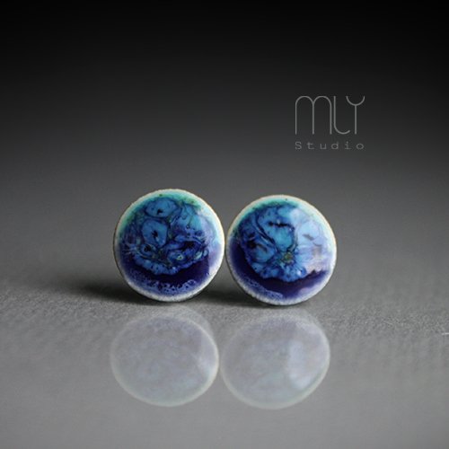 Ceramiczne okrągłe kolczyki w formie sztyftów, ręcznie wykonane z delikatnej gliny kamionkowej, jednostronnie szkliwione mieszanką zielonych i błękitnych szkliw z efektem plamek, na antyalergicznych sztyftach w kolorze srebrnym. Średnica ok.9mm. Polecam
