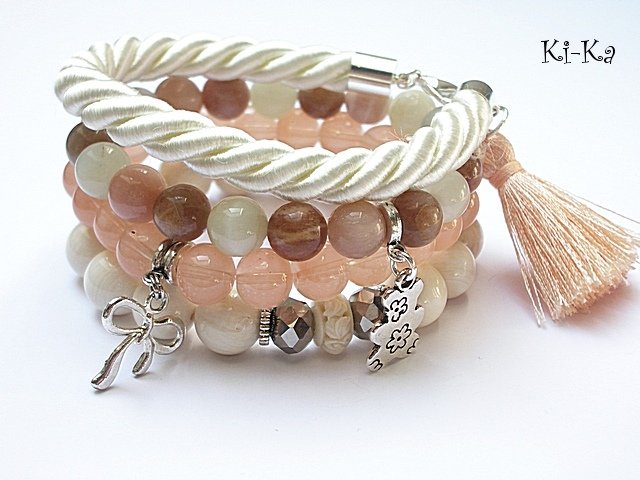 PROJEKT AUTORSKI. Komplet czterech bransoletek wykonany z kamieni naturalnych - kamień słoneczny [8mm], naturalny koral [10mm], kryształków [10 x 8mm], szkła [10mm], przekładki z rzeźbionego korala, satynowej liny, chwostu oraz elementów w kolorze srebra. Pasują na nadgarstek 15,5 -16,5cm. Bransoletki z kamieni na gumce silikonowej. Biżuteria ozdobnie zapakowana. W identycznym secie naszego autorstwa zaprezentowała się Pani Dorota Szelągowska w programie Domy Gwiazd 2 z wizytą u Mariana Lichtmana.