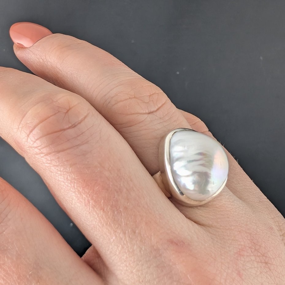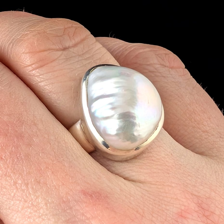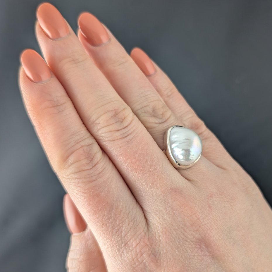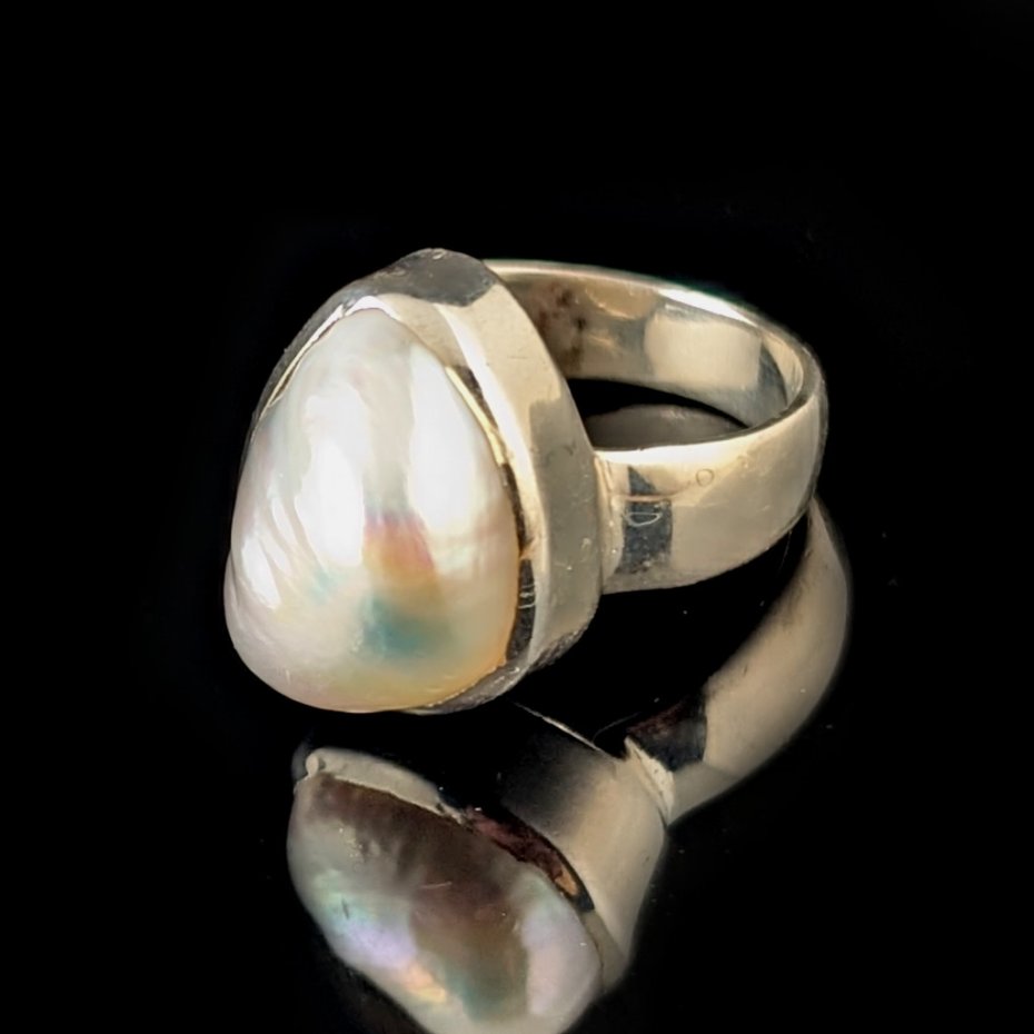 Pierścień wykonany ze srebra próby 925 z oprawioną okazałą, piękną naturalną perłą. Ponadczasowa elegancja, klasyka z nutą awangardy. Wymiary 17 x 14 mm, waga pierścienia 8,5 g. Rozmiar jubilerski 16. Szerokość obrączki to 6 mm. Wykonany przez dostawcę kamieni.