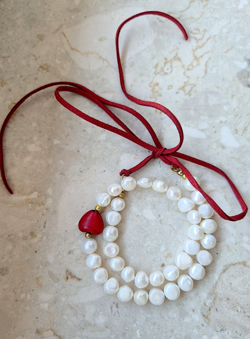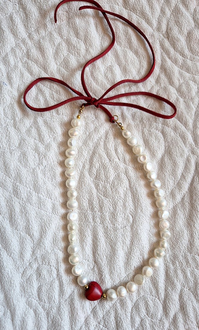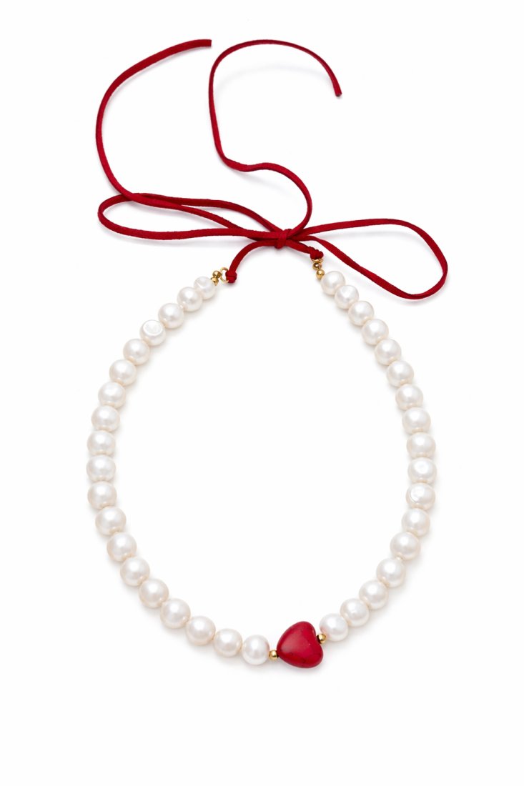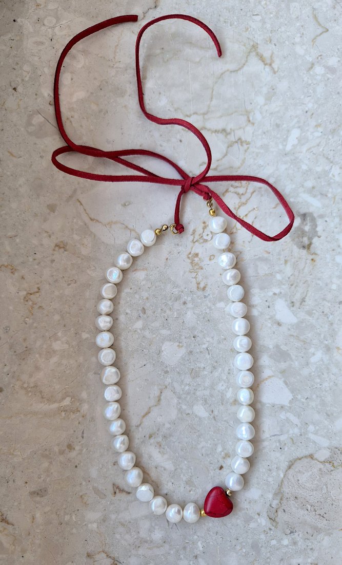 Naszyjnik wykonany z pereł hodowlanych o nieregularnym kształcie i średnicy 8-10 mm, ozdobiony sercem z howlitu. Zapięcie regulowane - w formie czerwonego rzemyka.