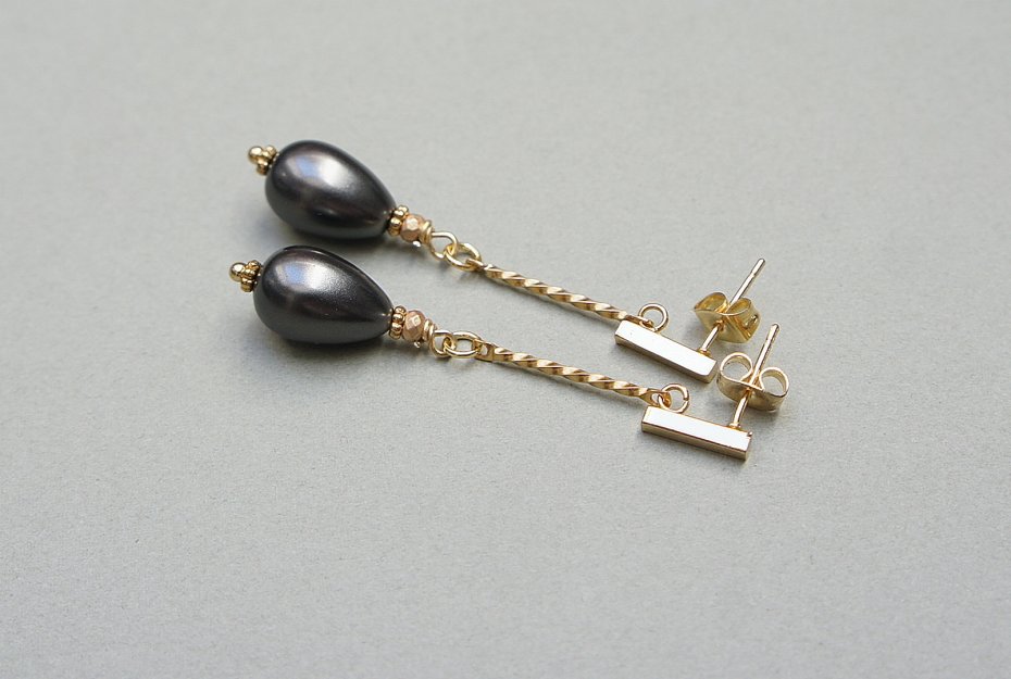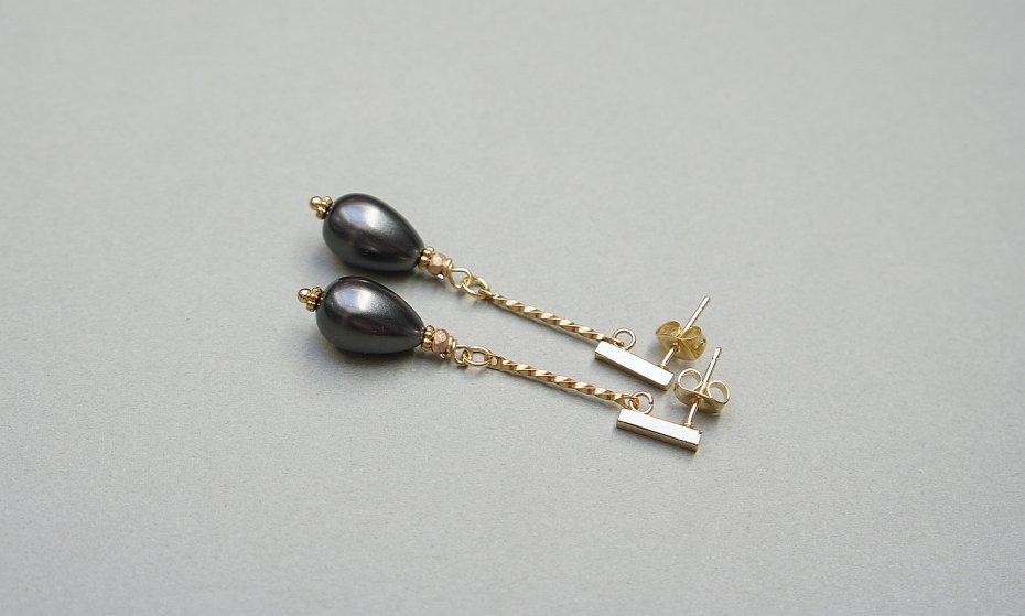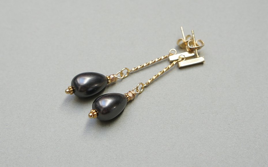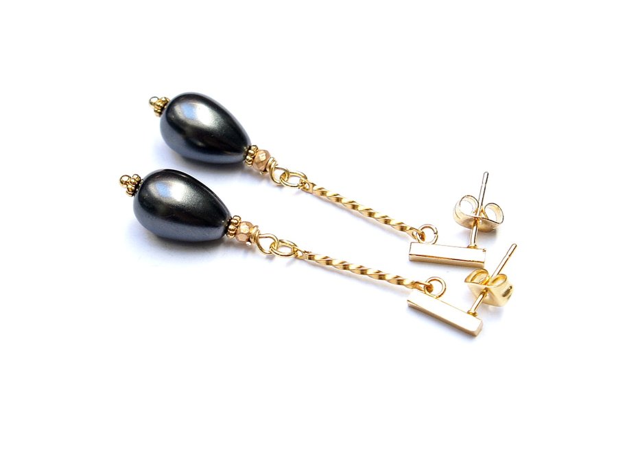 Eleganckie kolczyki wykonane z grafitowych pereł seashell [12 x 10mm] oraz z pozłacanej stali szlachetnej. Długość kolczyków: ok. 5,3cm. Biżuteria ozdobnie zapakowana.
