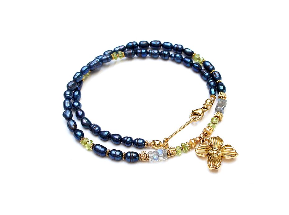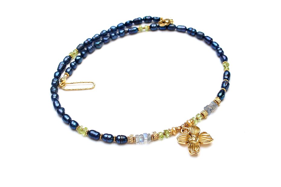 Krótki, delikatny naszyjnik wykonany w całości z naturalnych, słodkowodnych pereł [ok. 5 - 6mm], nieregularnych talarków labradorytów [ok. 4 x2mm], nieregularnych talarków oliwinu [ok. 3 x 2mm], hematytu fasetowanego, platerowanego [4x2mm oraz 2mm], przekładek z hematytu [1mm] oraz z pozłacanej stali szlachetnej. Długość naszyjnika: ok. 42,5cm. Biżuteria ozdobnie zapakowana.