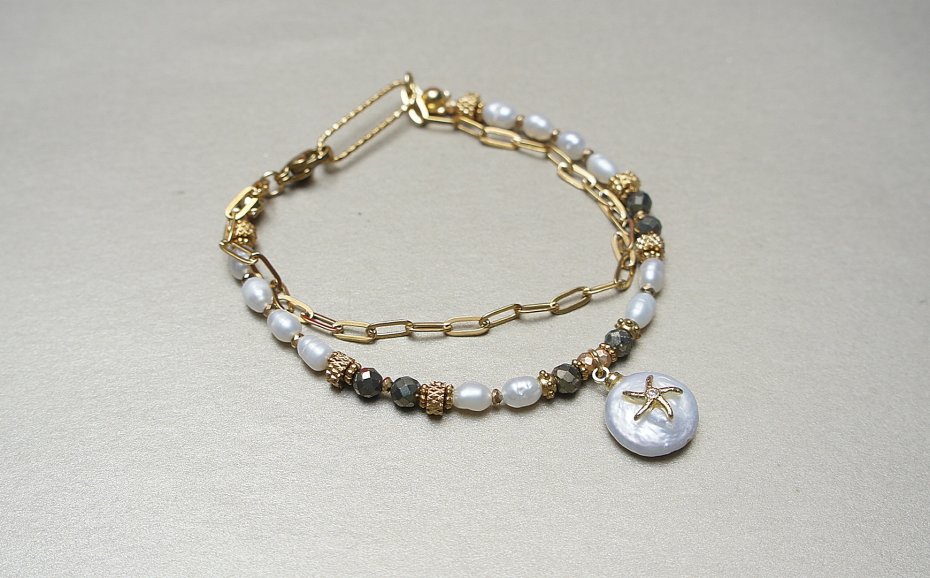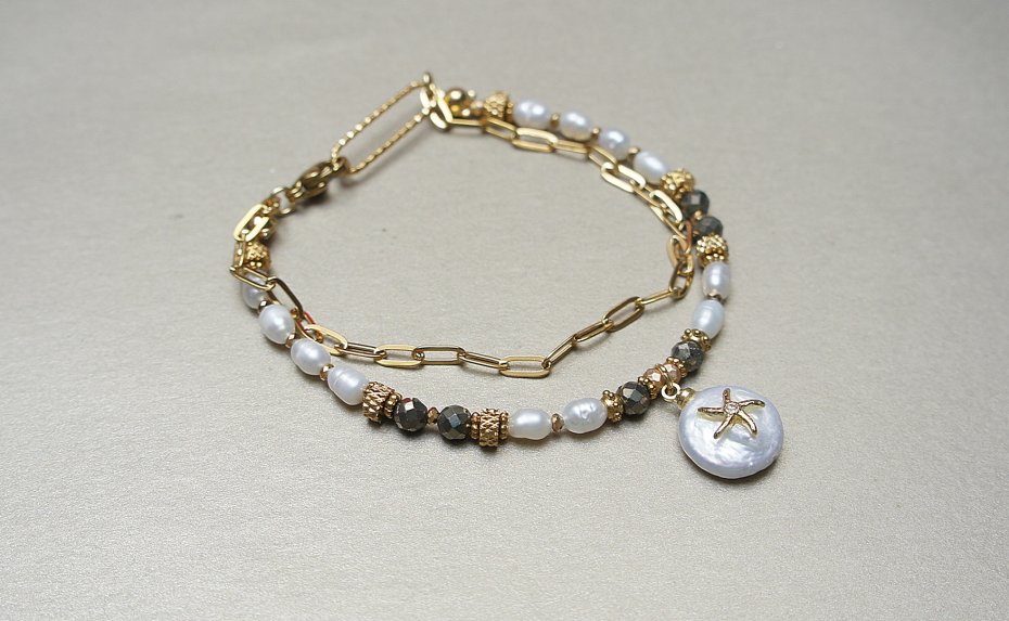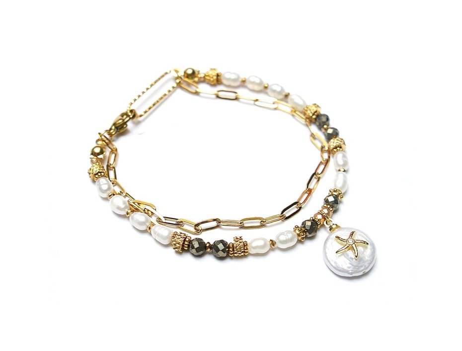 Bransoletka wykonana w całości naturalnych, słodkowodnych pereł [ok. 6mm], fasetowanych pirytów [4mm], fasetowanych, platerowanych hematytów [2 i 3mm], przekładek z hematytu [1mm], zawieszki z perły naturalnej słodkowodnej w kształcie monetki [12mm] oraz z pozłacanej stali szlachetnej. Całkowita długość bransoletki 18cm.
