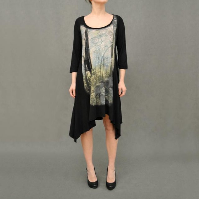 Świetna asymetryczna sukienka z pejzażem. Marka Lindex. Pejzaż robi wrażenie lekko spranego przy bliższym przyjrzeniu się ale wydaje mi się że to celowy efekt zamglenia.