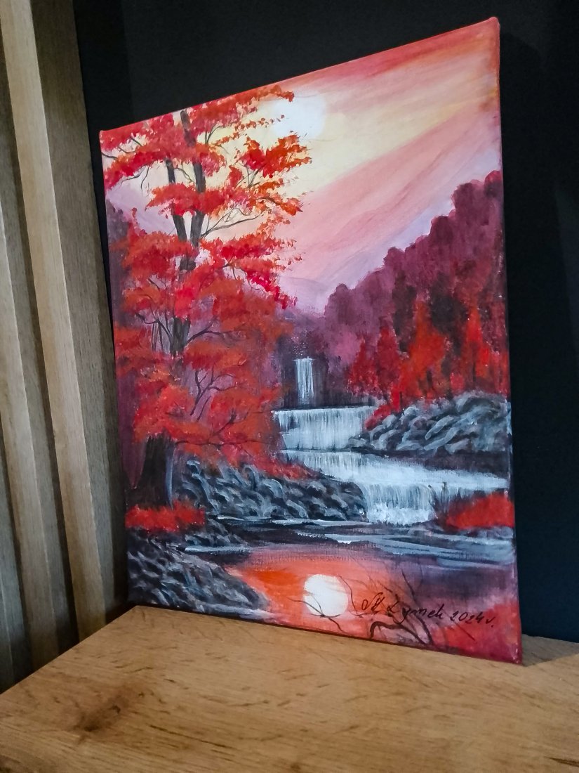 Wyjątkowy, ręcznie malowany obraz, który przeniesie magię złotej jesieni prosto do Twojego wnętrza. Dynamiczna scena z wodospadem, otoczonym drzewami w intensywnie ognistych barwach. Kontrast między chłodną, białą wodą a ciepłymi barwami liści tworzy niezwykle nastrojową kompozycję, która wprowadza spokój i ciepło. Przepięknie udekoruje ściany salonu, sypialni, czy gabinetu. Idealny również jako prezent na każdą okazję.