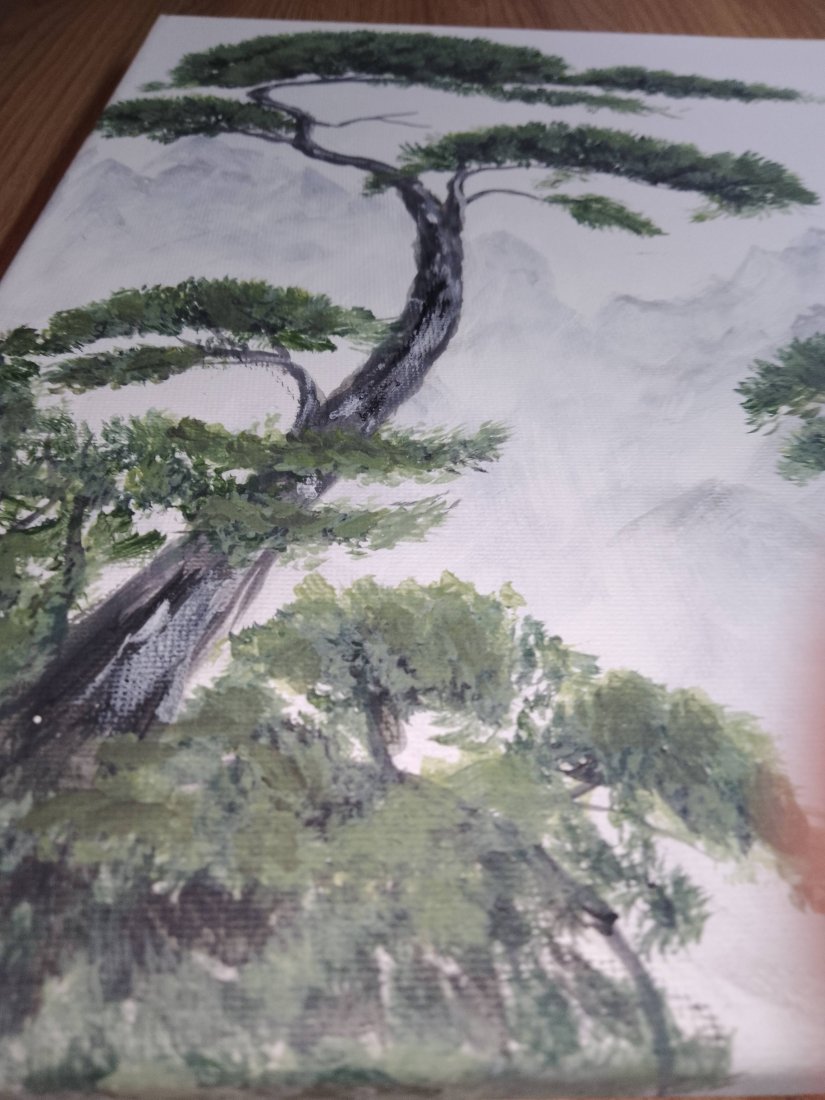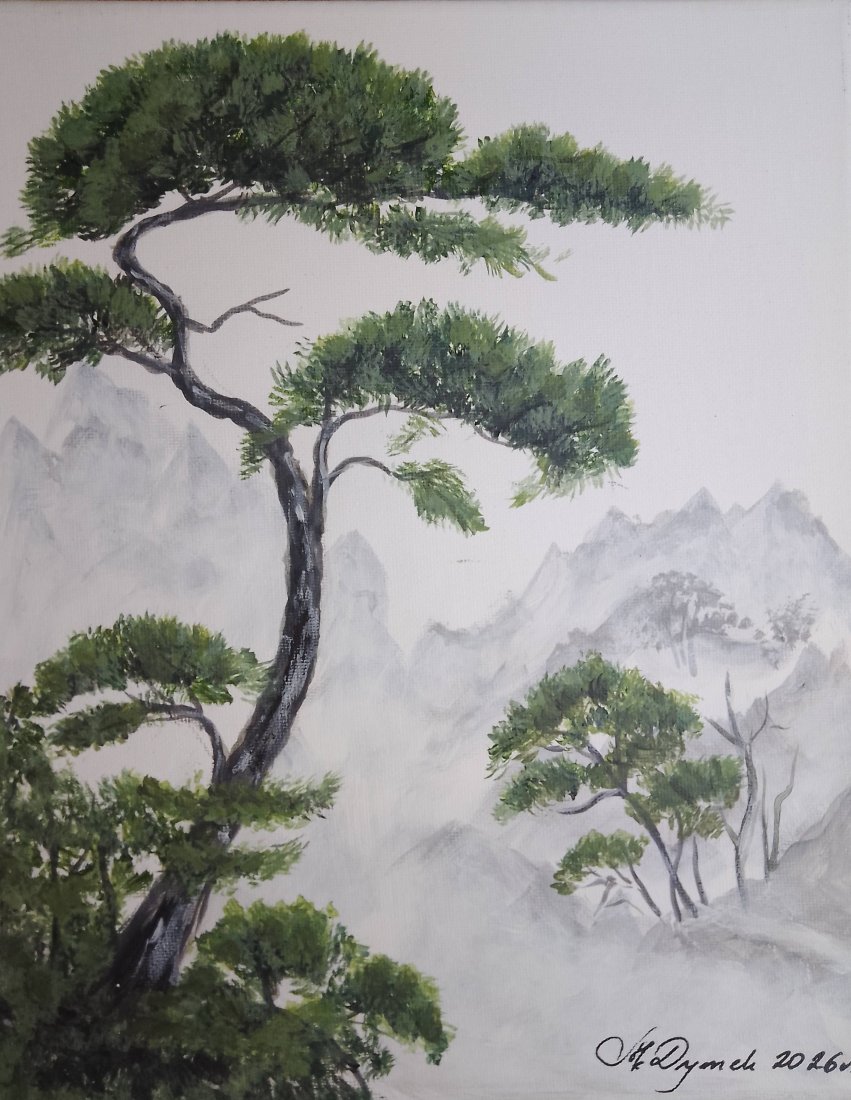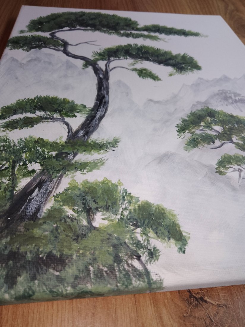 - Tematyka: Malowniczy pejzaż inspirowany estetyką orientu. Przedstawia wiekowe sosny na tle zamglonych monumentalnych gór. Kompozycja symbolizująca trwałość, siłę i spokój ducha