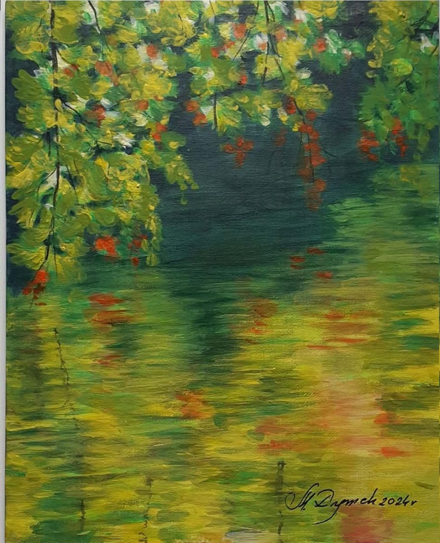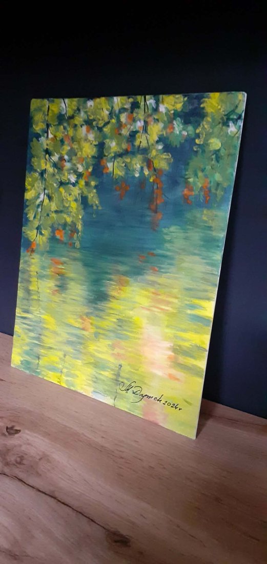 Nastrojowy pejzaż przenoszący widza nad brzeg spokojnego stawu w letnie popołudnie. Idealnie oddaje migoczące światła i odbijającą się roślinność w lustrze wody. Głębokie, ciemne tło górnej części nadaje obrazowi głębi i sprawia, że barwy pierwszego planu niemal "świecą'. Ta subtelna gra świateł wprowadza do wnętrza atmosferę spokoju oraz harmonii i powiew świeżości. Przepięknie udekoruje ściany salonu, sypialni, czy gabinetu. Idealny również jako prezent na każdą okazję dla miłośników natury i polskiego krajobrazu.