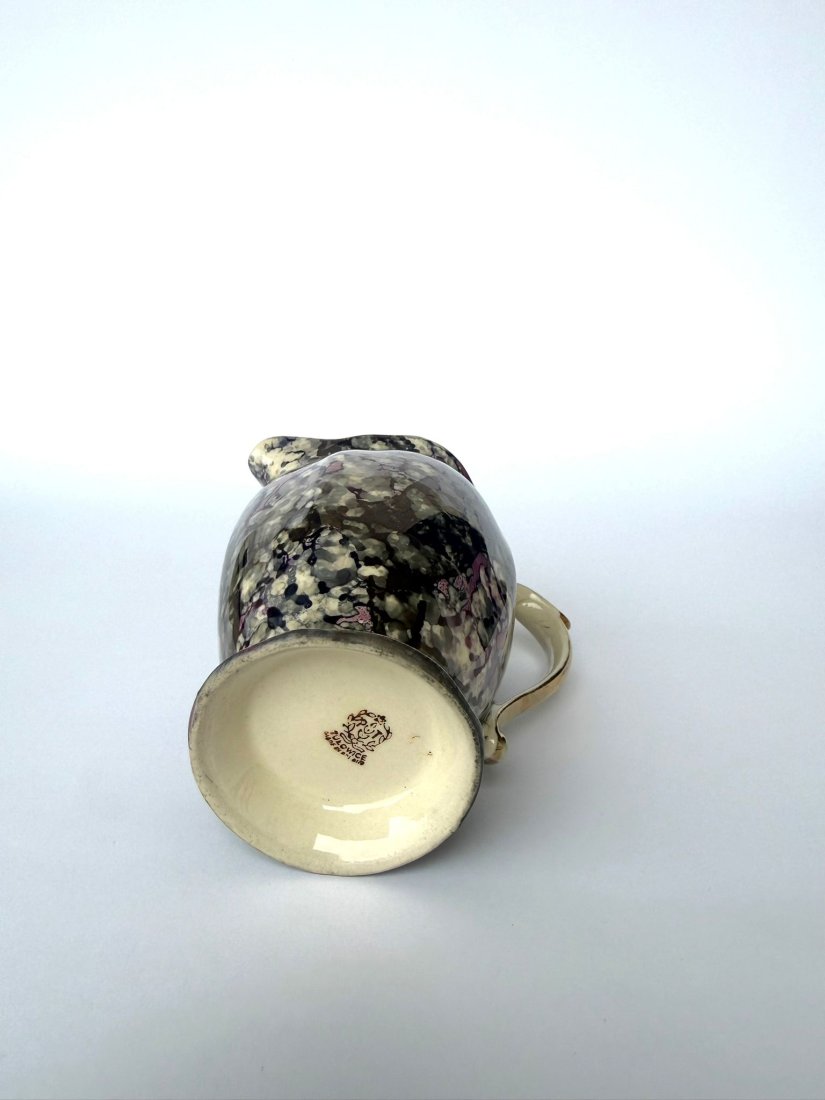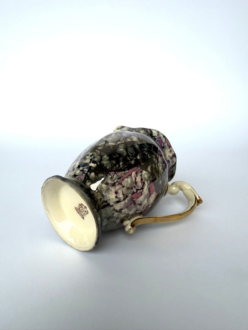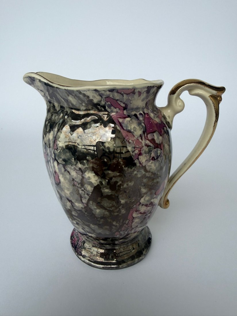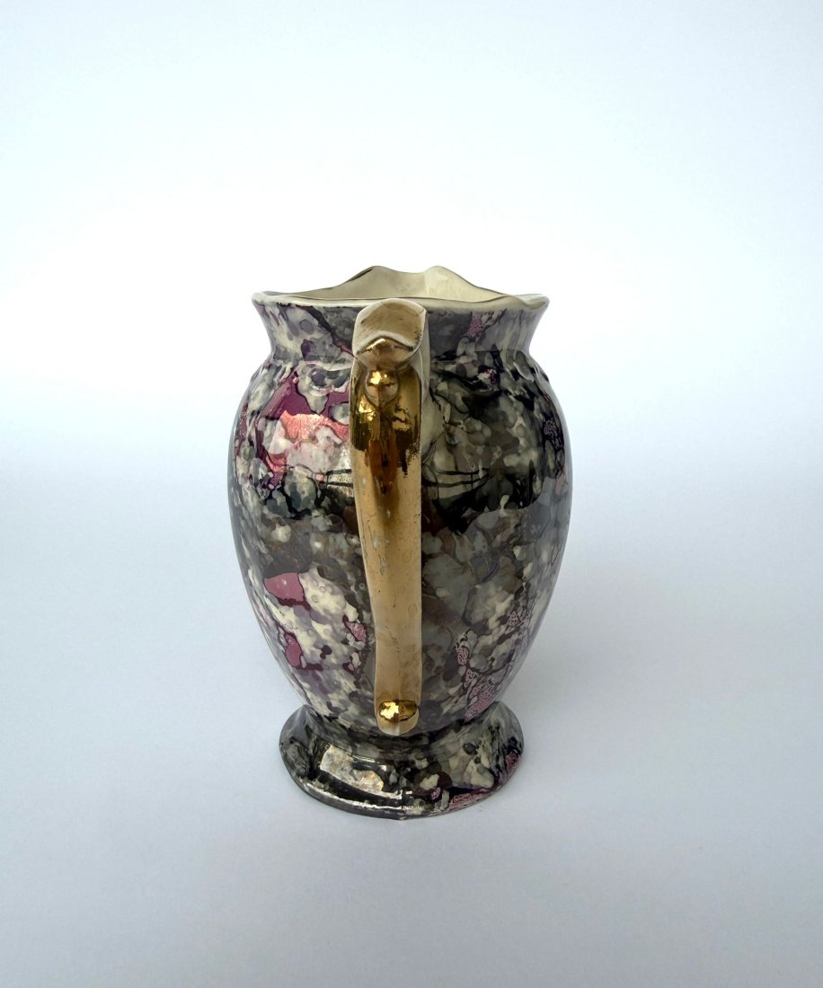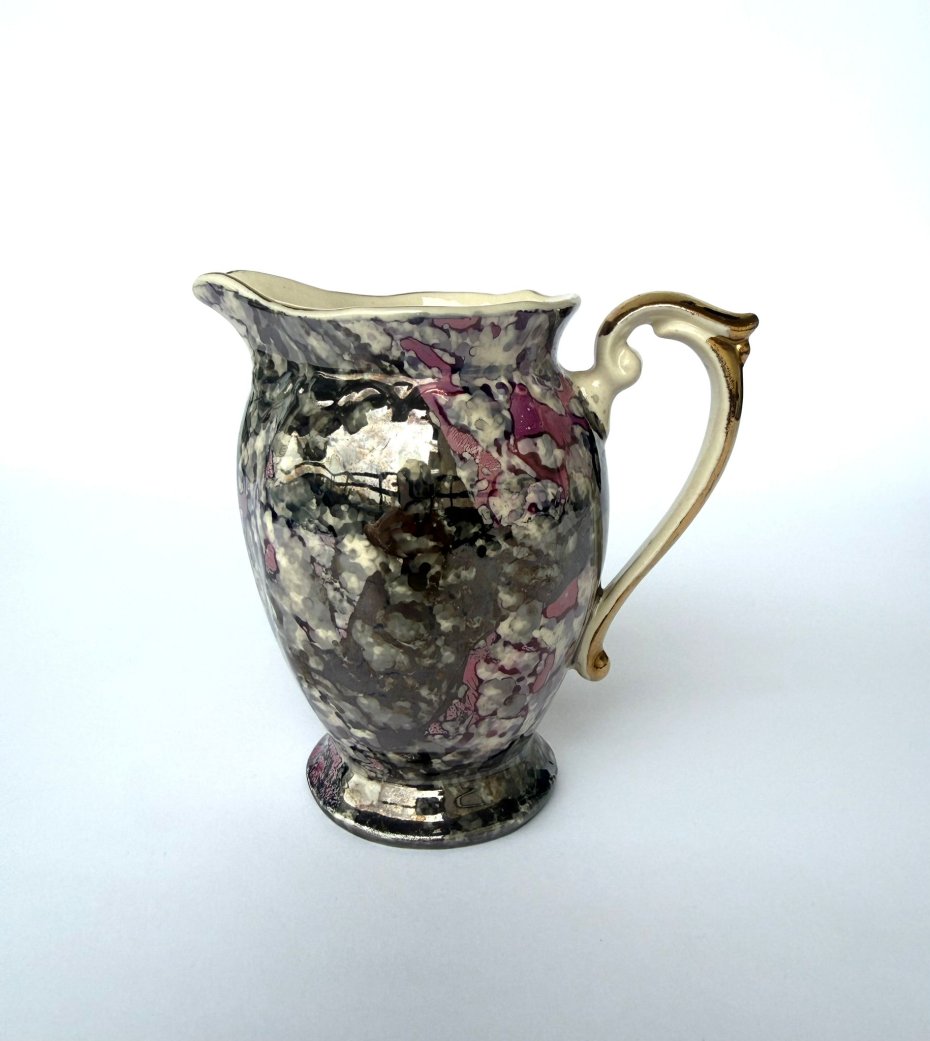 Wyjątkowej urody mlecznik pochodzący z wytwórni Tułowice, poszukiwana malatura marmurek (utrzymany w rzadkim zestawieniu fioletowo‑srebrnych tonów ze złoconymi detalami). Lustrzana powierzchnia pięknie podkreśla nieregularny układ barw, tworząc efekt eleganckiego, dekoracyjnego marmuru.