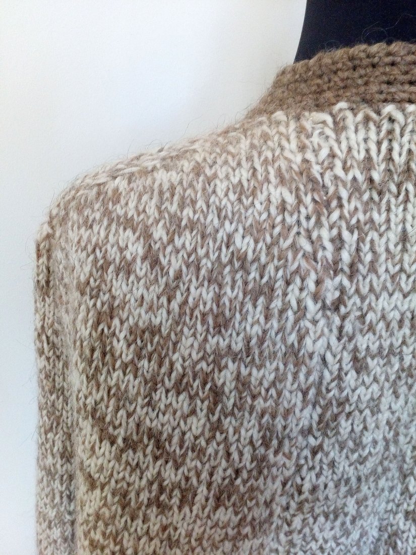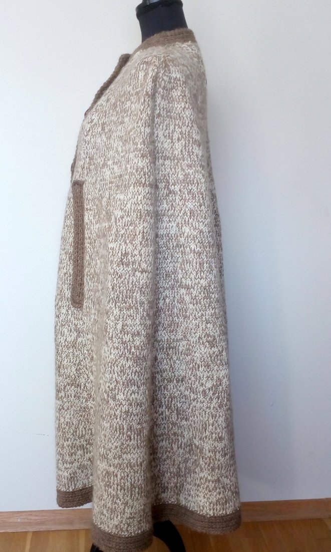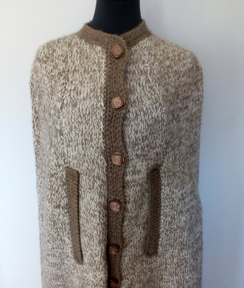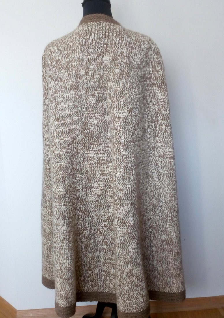 Wełniana peleryna wykonana ręcznie na drutach, z wełny w melanżowym kolorze ecru i wielbłądzi beż, masywna, ciepla zapinana na guziki, z przodu w miejscu beżowe listwy otwory na ręce