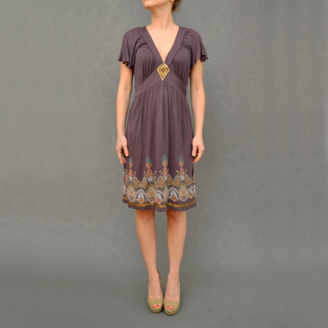 Sukienka w śliwkowym kolorze marki PEPE JEANS. W etnicznym stylu, pomiędzy biustem cekiny, na dole wzór i podłużne cekinki, ale wszystko w wyważonym stylu. Dekolt w mocny szpic.
