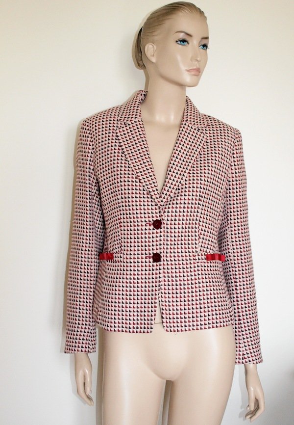 świetna marynarka marki H&M. materiał miękki, mieszanka akrylu wełny i poliestru.przeplatane nitki w kolorze różowym i bordowym. kieszonki wykończone rypsowymi kokardkami. Stan bardzo dobry, prawdopodobnie nowa. Rozmiar z metki 42, mnie wydaje się że 40. . Podaję wymiary mierzone na płasko;