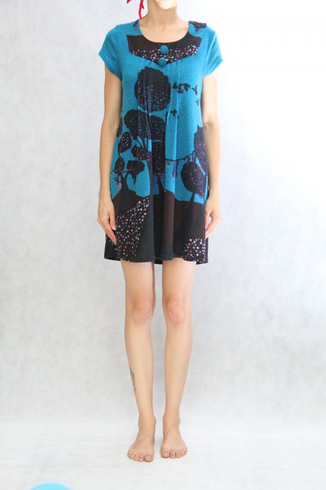 Cieplutka sukienka z motywem leśnym, drzewami i sarenkami.