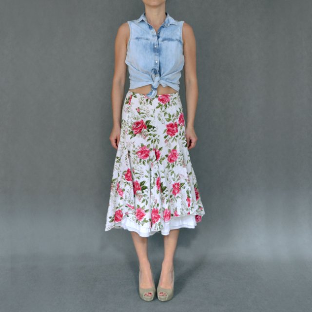 Spódnica marki PER UNA w róże. Od spodu falbaniasta halka, która z przodu uwodząco wystaje. Dół rozszerzany z kontrafałdami co zwiększa jej objętość.