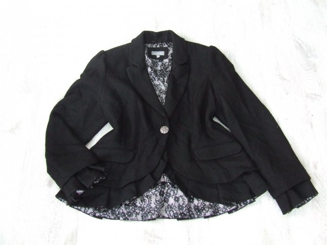 Śliczny, kobiecy żakiet w kolorze czarnym, zapinany na jeden ozdobny duży guzik. Z przodu są dwie kieszonki - atrapy. Żakiet posiada super satynową podszewkę w koronkowy deseń.