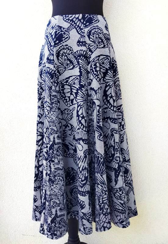 Spódnica z masywniejszej tkaniny dzianinowej w kolorystyce czerni, szarości i bieli. Szyta z klinów, ładnie się układa. Wciągana - bez zamka , podszyta gumą w pasie. Bez podszewki. Miał, podatna i rozciągliwa