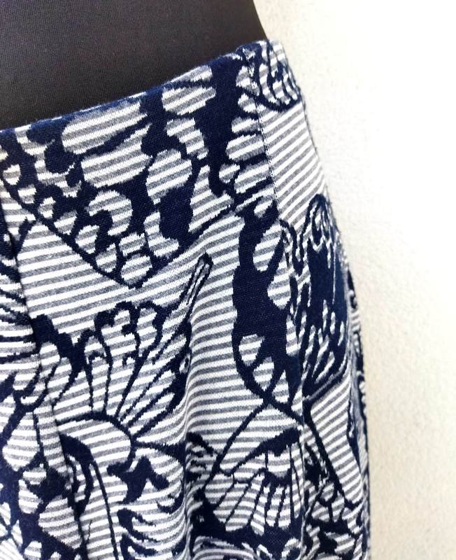 Spódnica z masywniejszej tkaniny dzianinowej w kolorystyce czerni, szarości i bieli. Szyta z klinów, ładnie się układa. Wciągana - bez zamka , podszyta gumą w pasie. Bez podszewki. Miał, podatna i rozciągliwa