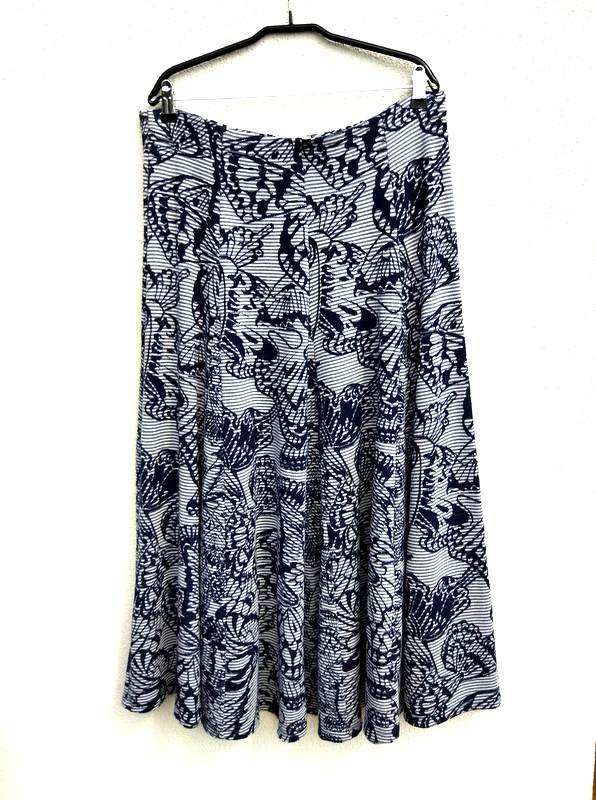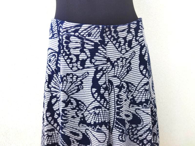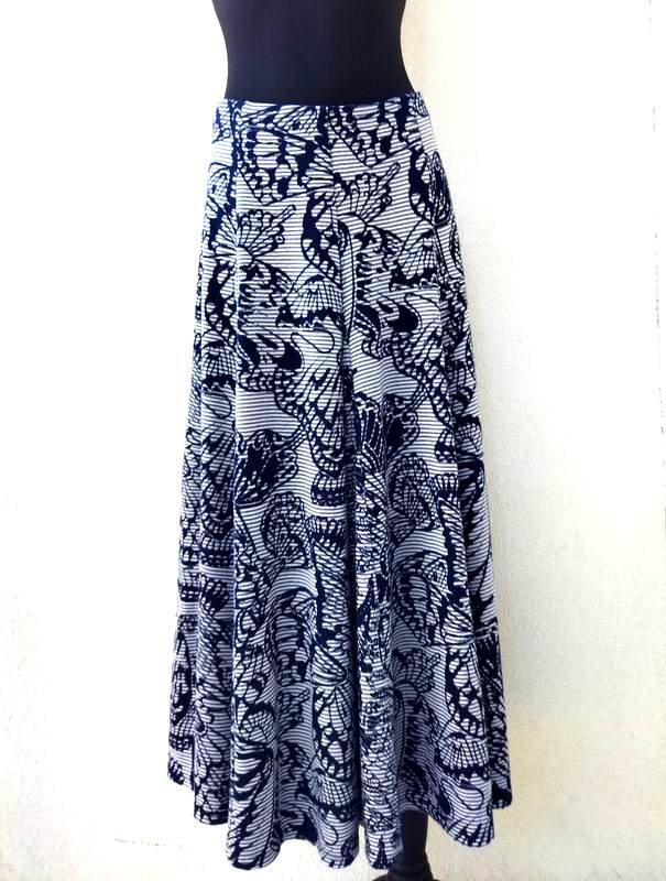 Spódnica z masywniejszej tkaniny dzianinowej w kolorystyce czerni, szarości i bieli. Szyta z klinów, ładnie się układa. Wciągana - bez zamka , podszyta gumą w pasie. Bez podszewki. Miał, podatna i rozciągliwa