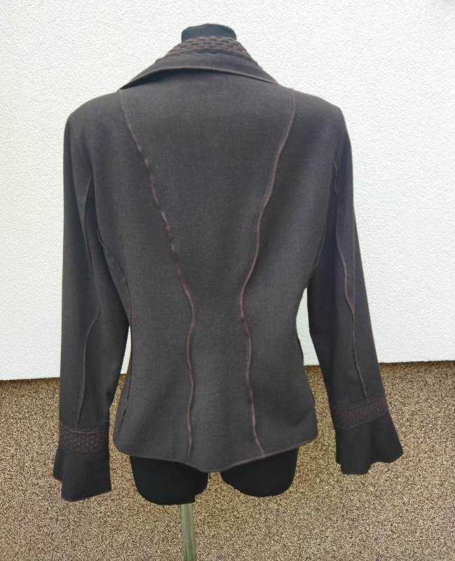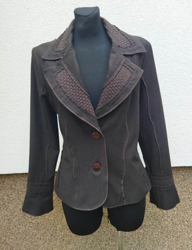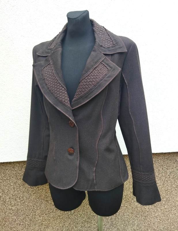 Ciekawa marynarka z wiskozowej tkaniny z poliestrem w kolorze gorzkiej czekolady z wstawkami z plecionych paseczków z bawełnianej tkaniny w kolorze marynarki. Wszystkie szwy skierowane na zewnątrz i endlowane nićmi w kolorze marynarki. Taliowana z kołnierzem z rewersami, zapinana na dwa duże guziki z fakturą plecionki. Całośc na podszewce