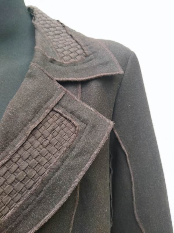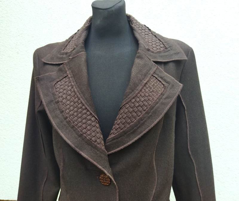 Ciekawa marynarka z wiskozowej tkaniny z poliestrem w kolorze gorzkiej czekolady z wstawkami z plecionych paseczków z bawełnianej tkaniny w kolorze marynarki. Wszystkie szwy skierowane na zewnątrz i endlowane nićmi w kolorze marynarki. Taliowana z kołnierzem z rewersami, zapinana na dwa duże guziki z fakturą plecionki. Całośc na podszewce
