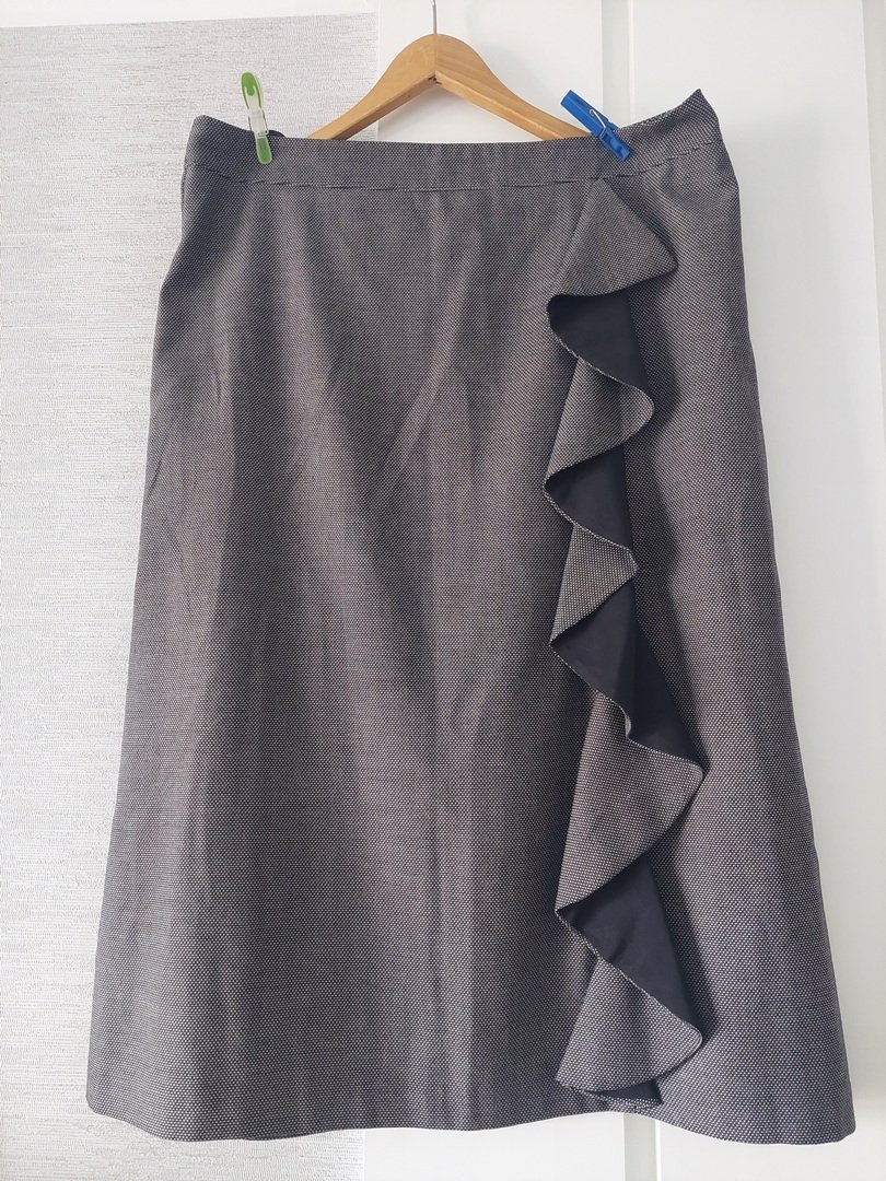 spódnica marki per una z falbaną z przodu. Materiał brak metki. zamek z tyłu. kolor drobna pepitka czarnych i białych nitek. stan bardzo dobry (prawdopodobnie wycięta podszewka?). Rozmiar z metki 16. proszę sprawdzić wymiary. Podaję wymiary mierzone na płasko;