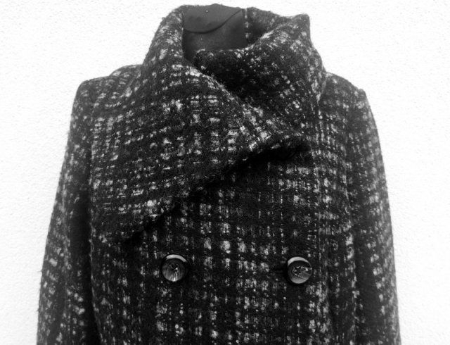 Świetnej jakości ciepły płaszcz z grubej tkaniny w kolorystyce czerni i gołębiej szarości, z przewagą wełny w składzie. Z dużym wykładanym kołnierzem, z dwiema wpuszczanymi kieszeniami, z krytym rozcięciem z tyłu u dołu. Dwurzędowy zapinany na guziki. Na eleganckiej czarnej podszewce. Dużo ładniejszy w realu