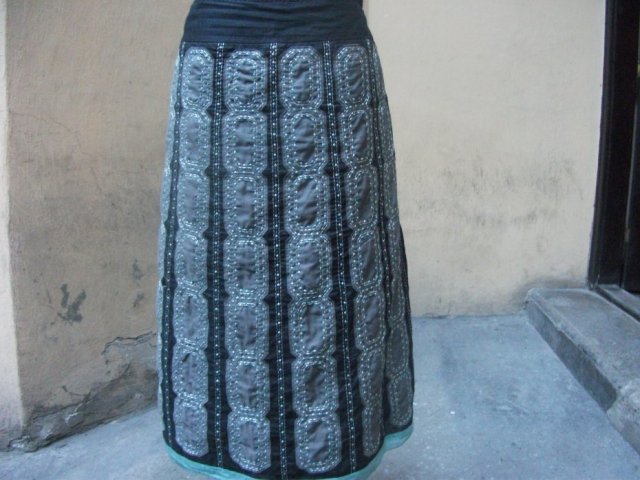 piękna spódniczka w niebanalnym zestawie kolorystycznym szary turkus i popiel haftowana srebrnymi koralikami ,na podszewce rozmiar z metki 10 firmy PER UNA -Speciale