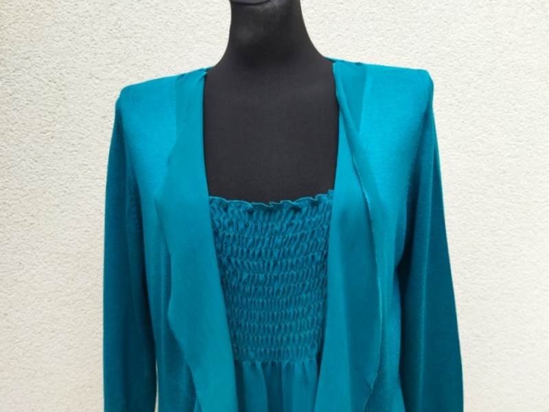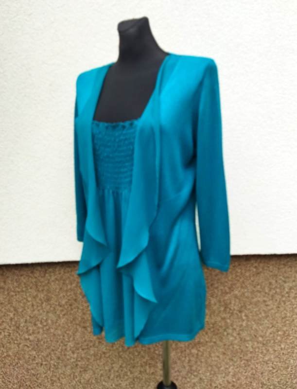 Cienki , miły wiskozowo-akrylowy sweterek w szmaragdowym kolorze z falbanką i drapowaną wstawką z przodu z poliestrowej żorżety w tym samym kolorze.