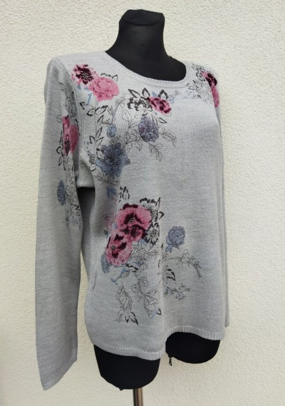 Akrylowy sweter w jasnoszarym kolorze z malowanym i miejscowo haftowanym wzorem kwiatowym w stonowanej kolorystyce. Wykończony wąskimi ściągaczami